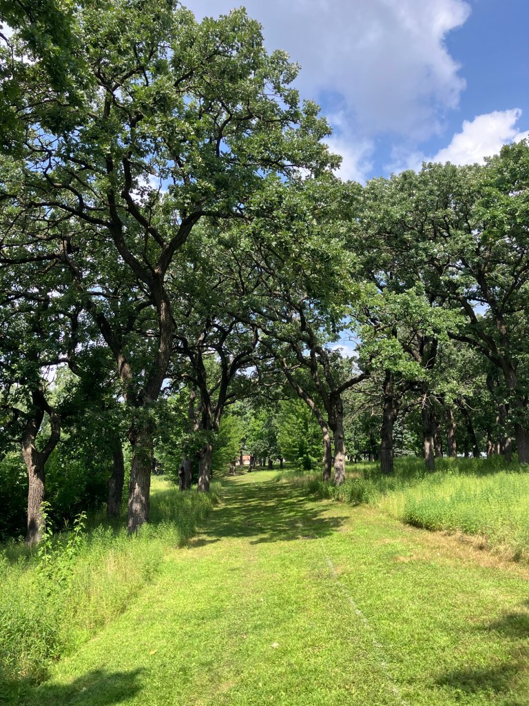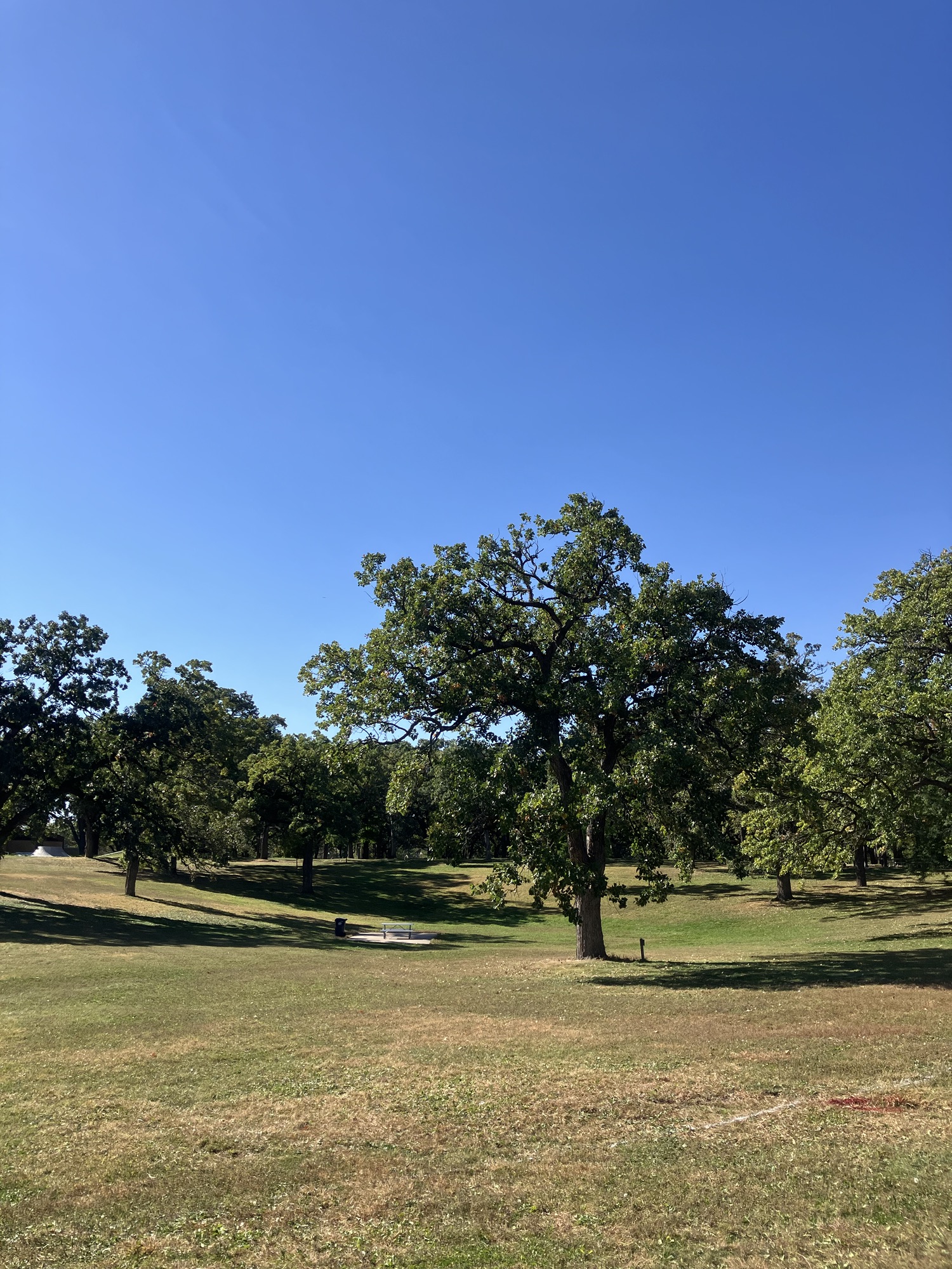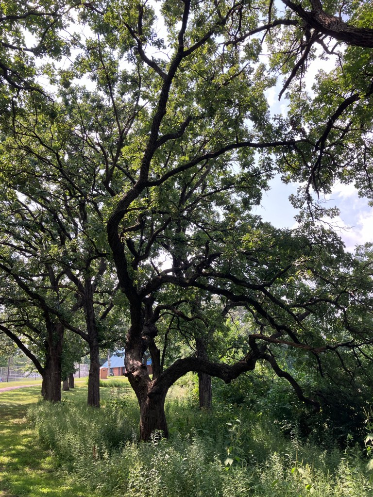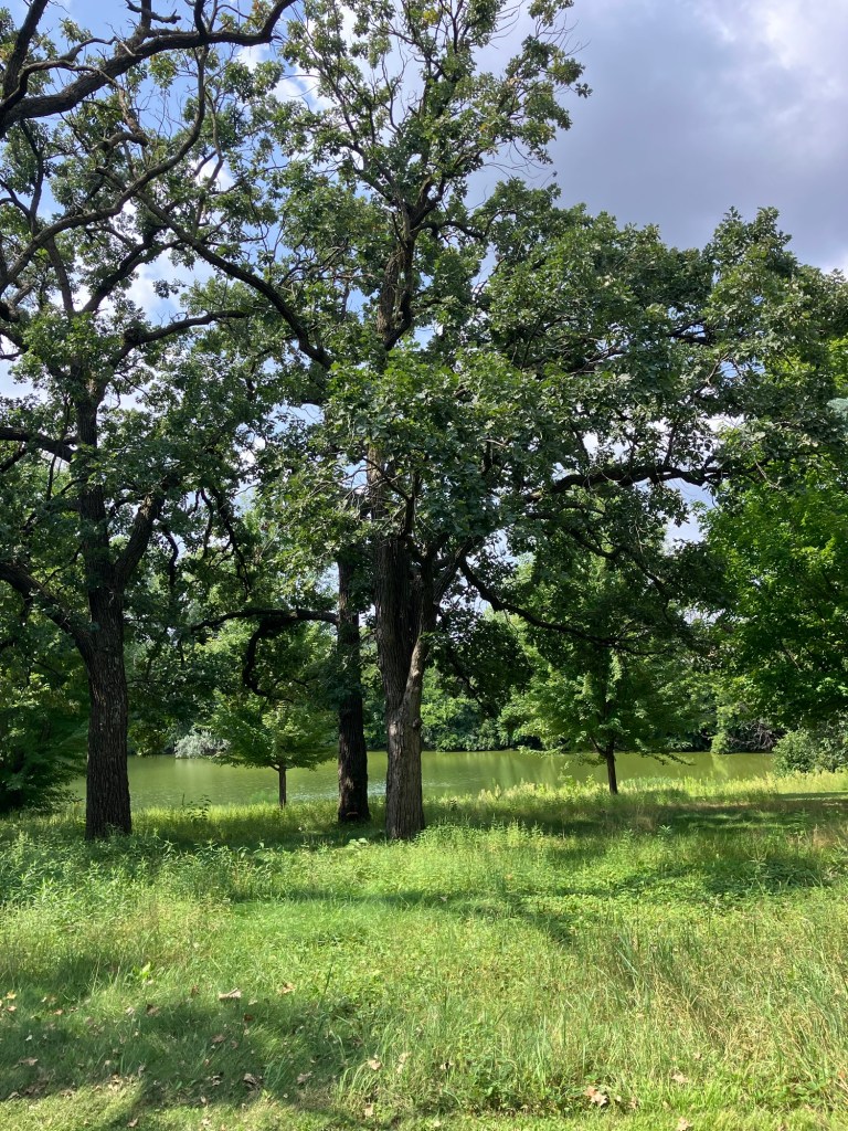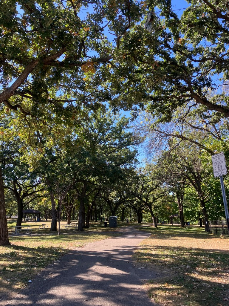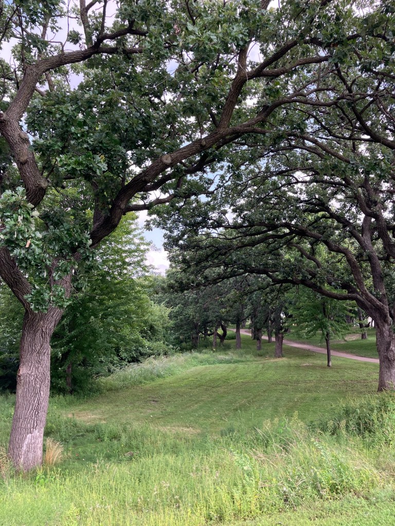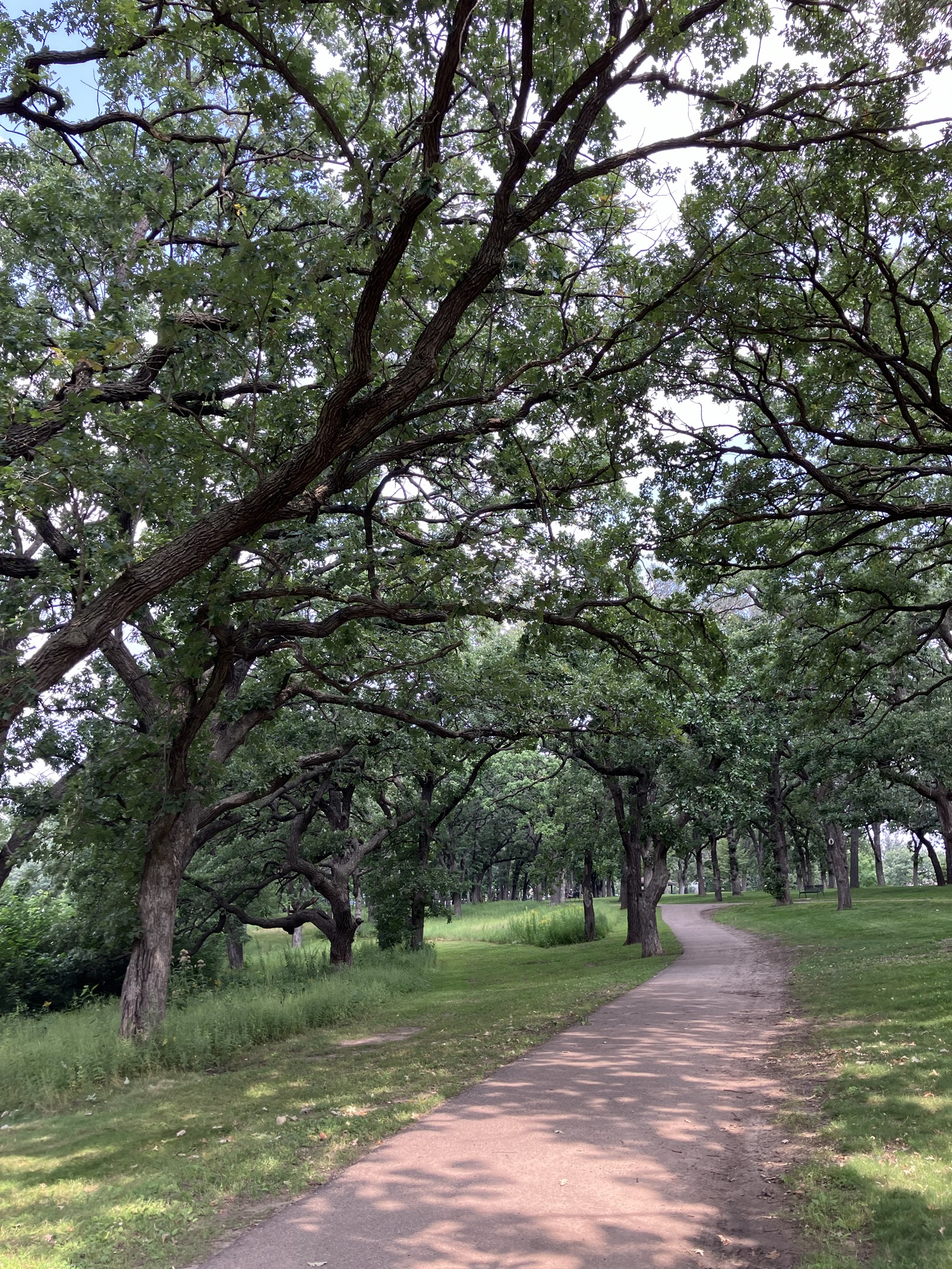 Augsburg Park in Richfield, MN is sort of a classic park, featuring rolling hills of manicured grass and oaks with a forked path between the north and south edges of the block. The east end of the park features a public library (closed for construction) and a small community center in the northeast corner. There is an ever-busy “Adventure Park” playground with a sort of artificial “nature” theme, but it does have reasonably accessible play equipment at least. There’s even a small section of colorful statues that are vaguely appropriate for toddlers to climb on. A redeeming feature of this park is found down the hill from the central path, where a grassy mowed path creates a beautiful sort of loop along the lake before rejoining the pavement. Overall, it’s a fine park for a shady picnic and a short walk for a toddler. I recommend parking in the south lot.