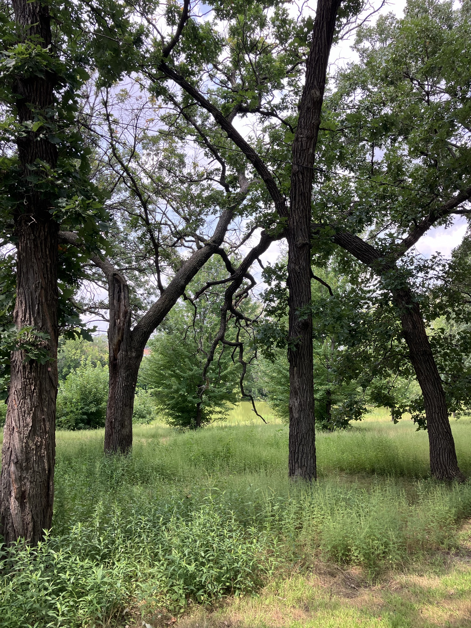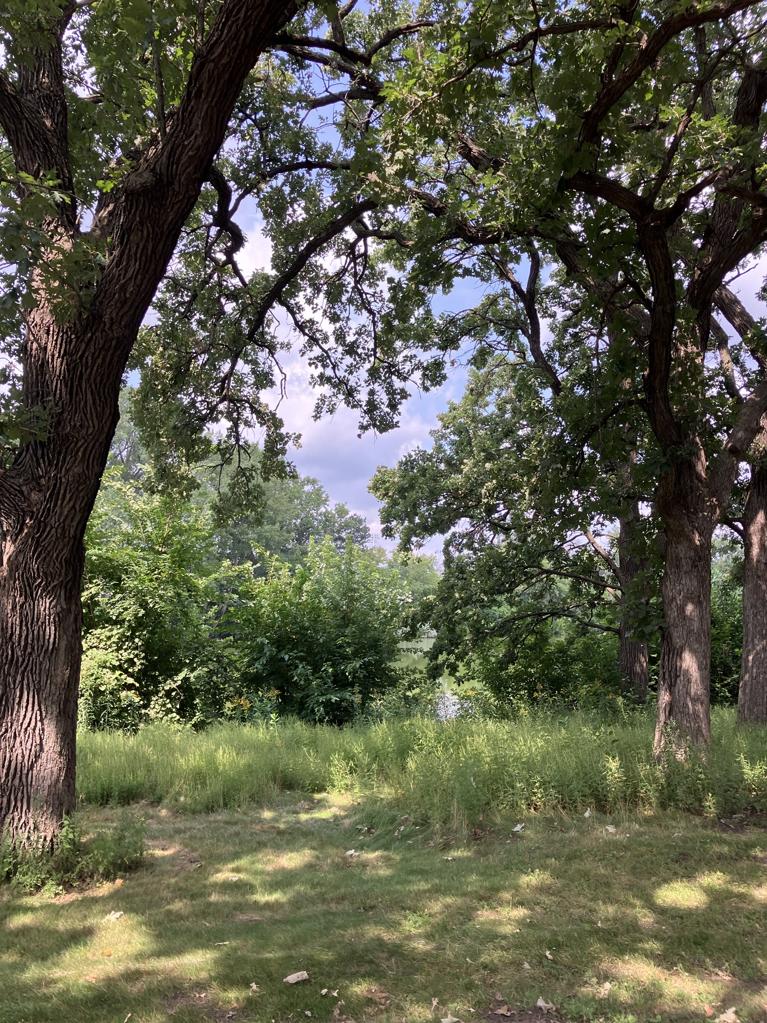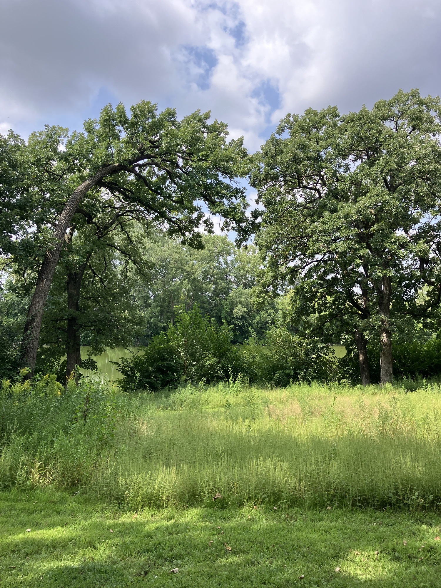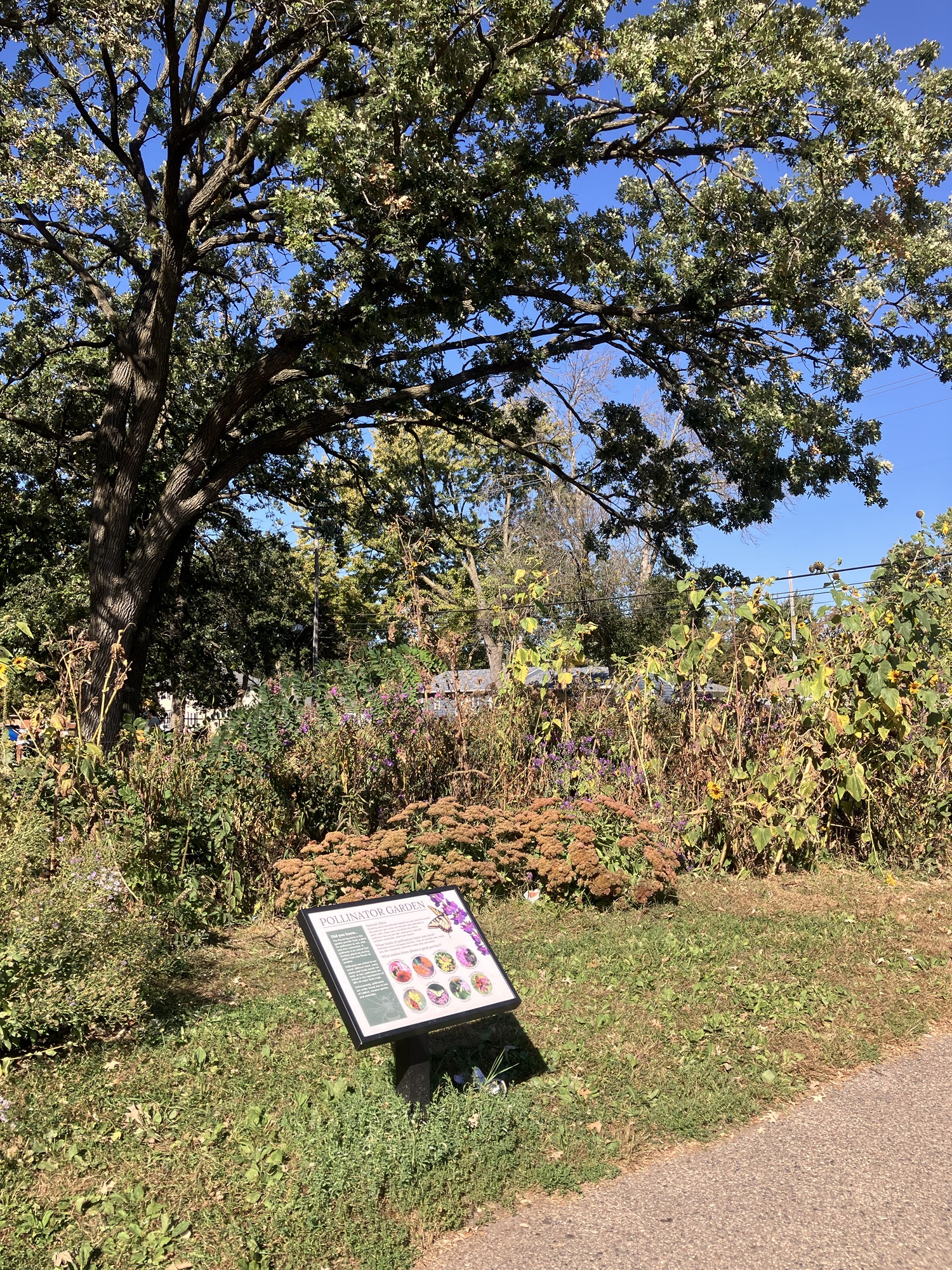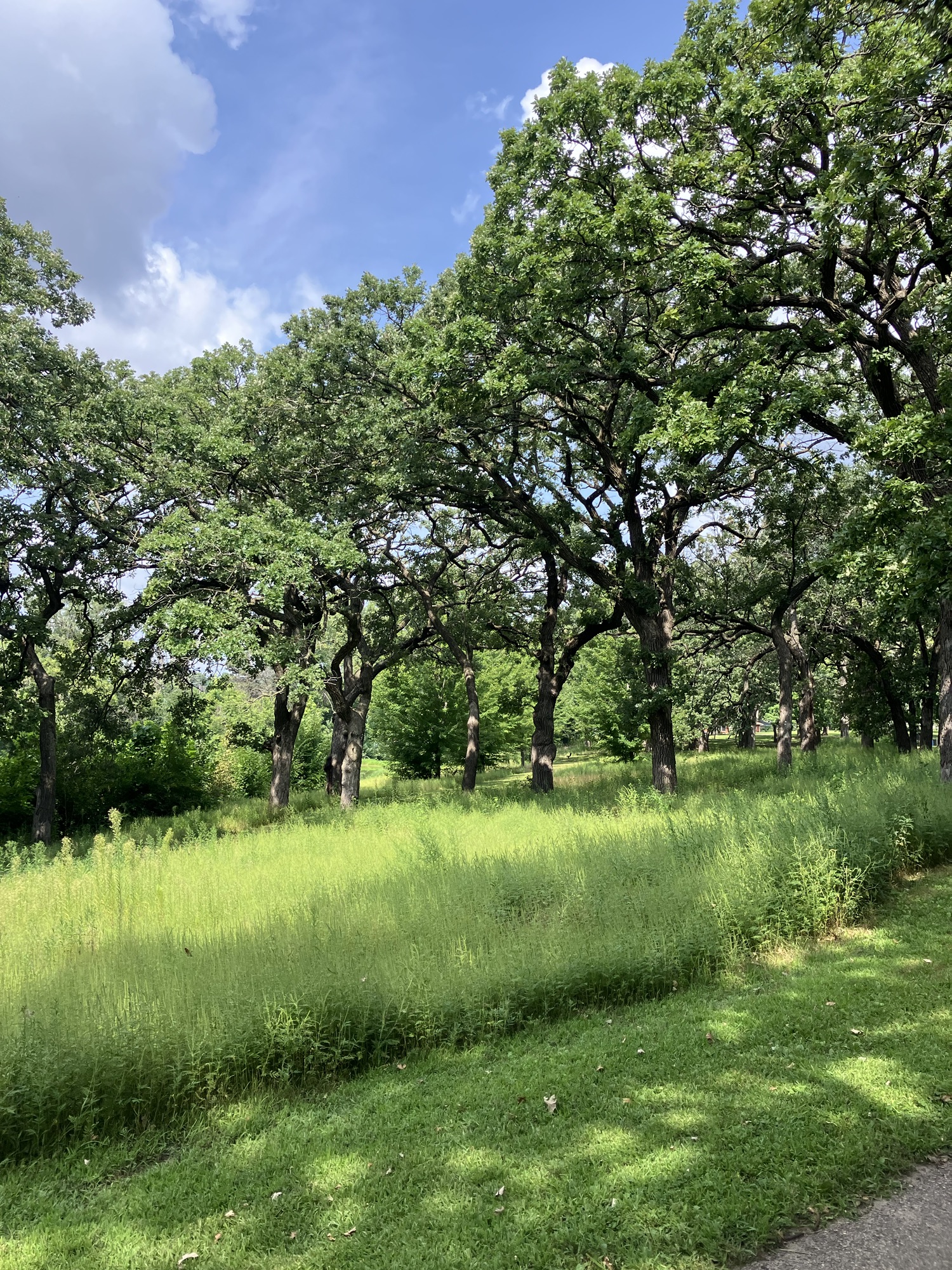 Augsburg Park in Richfield, MN is sort of a classic park, featuring rolling hills of manicured grass and oaks with a forked path between the north and south edges of the block. The east end of the park features a public library (closed for construction) and a small community center in the northeast corner. There is an ever-busy “Adventure Park” playground with a sort of artificial “nature” theme, but it does have reasonably accessible play equipment at least. There’s even a small section of colorful statues that are vaguely appropriate for toddlers to climb on. A redeeming feature of this park is found down the hill from the central path, where a grassy mowed path creates a beautiful sort of loop along the lake before rejoining the pavement. Overall, it’s a fine park for a shady picnic and a short walk for a toddler. I recommend parking in the south lot.