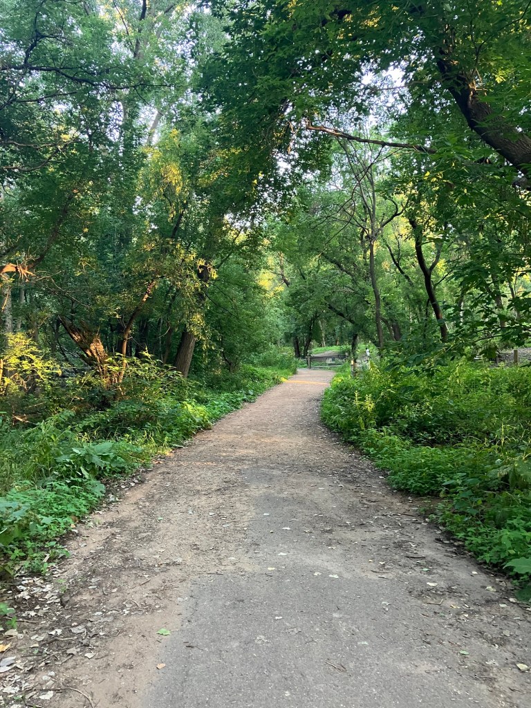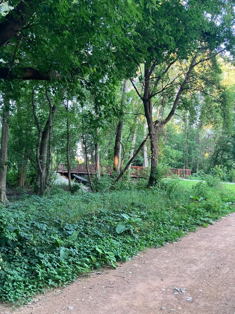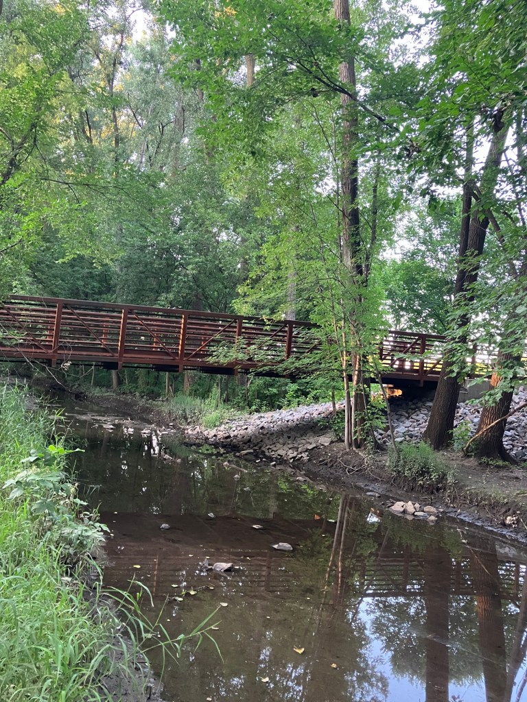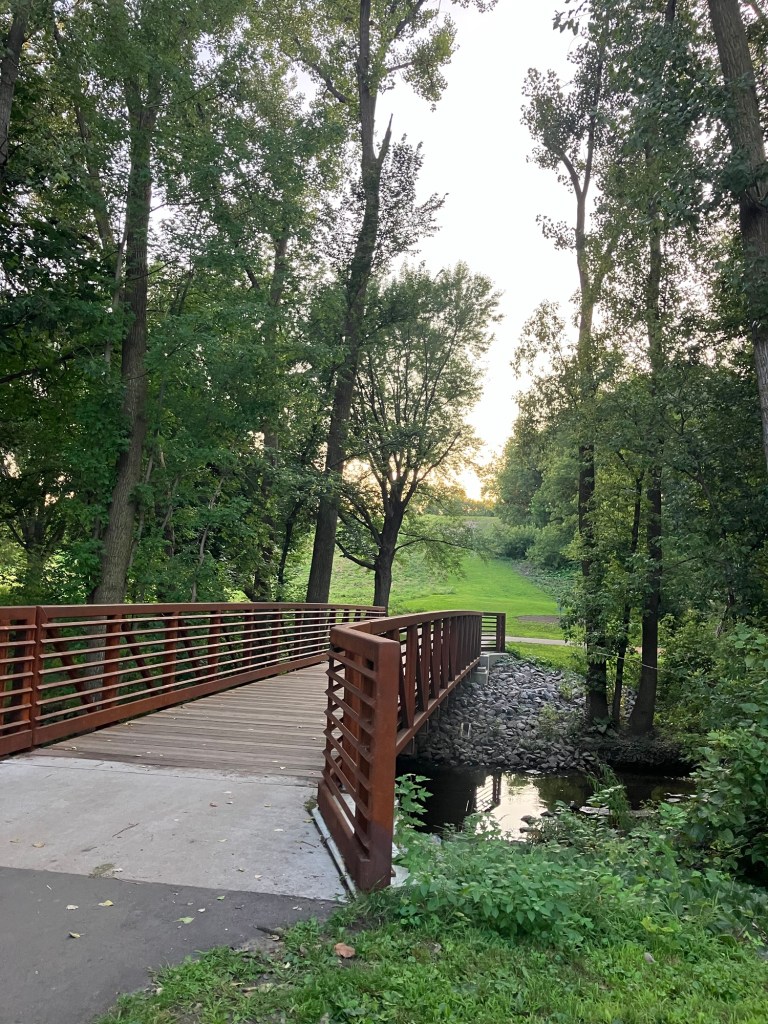 Bassett Creek Park in Crystal is a neighborhood park centered around a small woodsy stream that feeds into a scenic pond. The west side of the park is mostly comprised of a disc-golf course and a new (Fall 2023) dog park. The northeast end of the park is filled with sports fields and a playground. The east end features sprawling trees over a picnic area. A paved path from the small northeast parking lot follows the stream past the dog park, winding between the disc golf courses and water, around the pond, past the gardens, picnic space, & sports fields, wrapping around a small hill and rejoining itself across a small bridge that crosses over the stream and returns you north through the trees to the northeast lot.