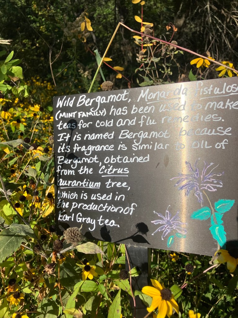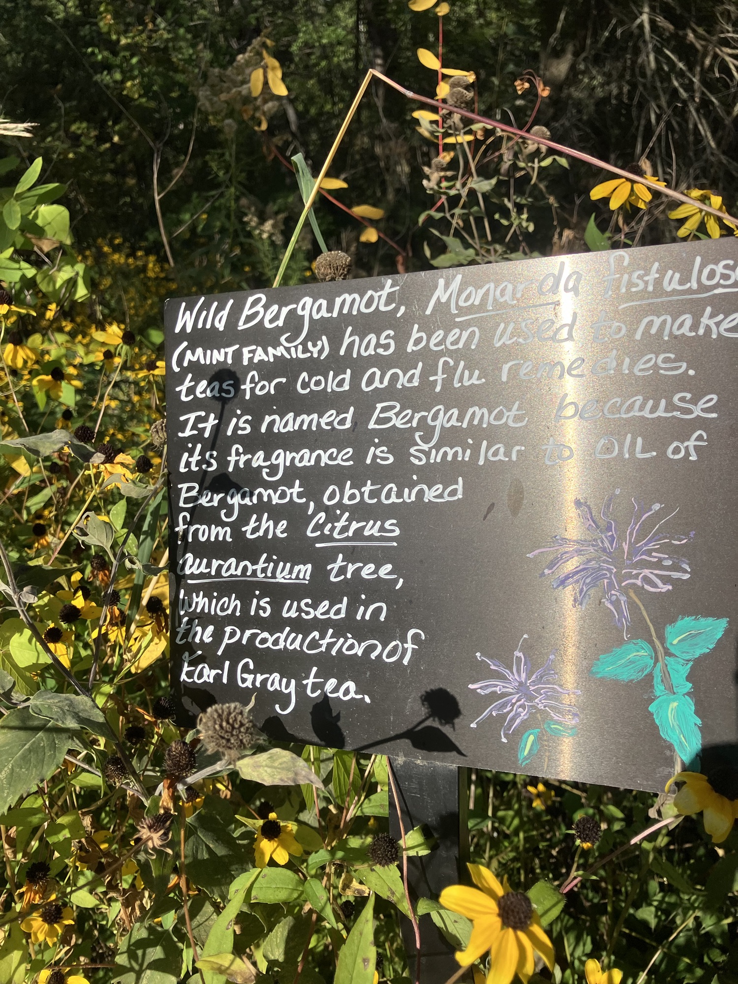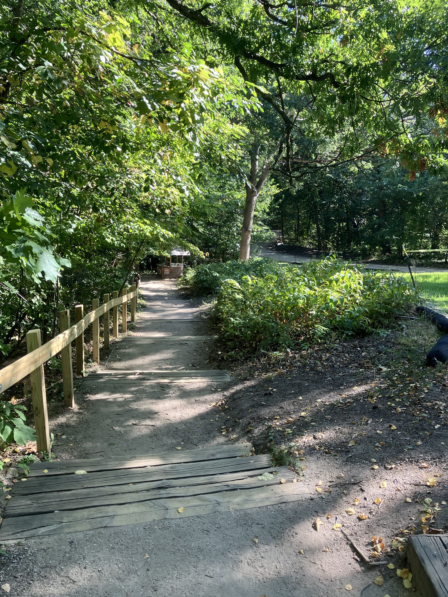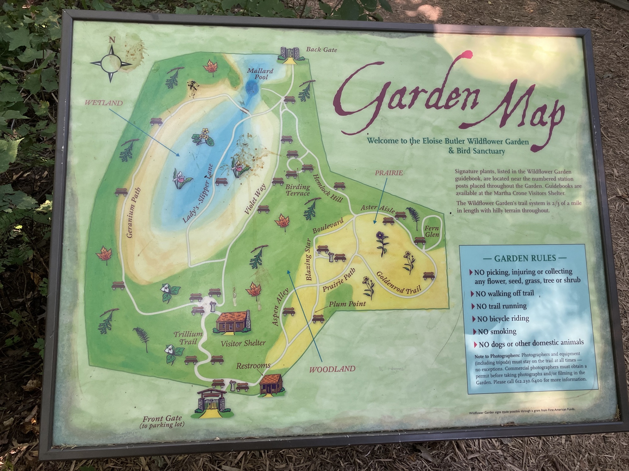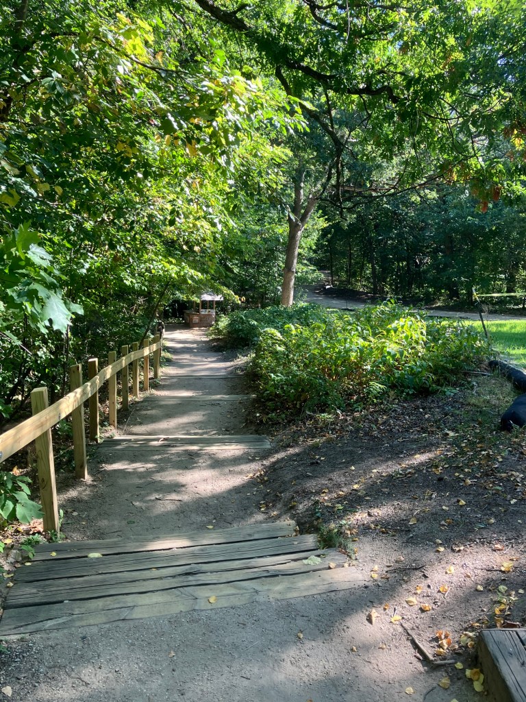 There are steps down to the park entrance that preclude wheels, but staff seem sure that a park driveway currently under construction will afford suitable access, eventually. Apple Maps and Google Maps both tried to bring me to the exit of a one-way parkway, where I dutifully passed and took the next available right turn. There’s small lot outside the garden entrance but there’s also a fair bit of marked parking spaces along the right side of the parkway. The outhouses are a little odd, having three seats, no stalls, one sink, and a small hook-and-eye door latch.