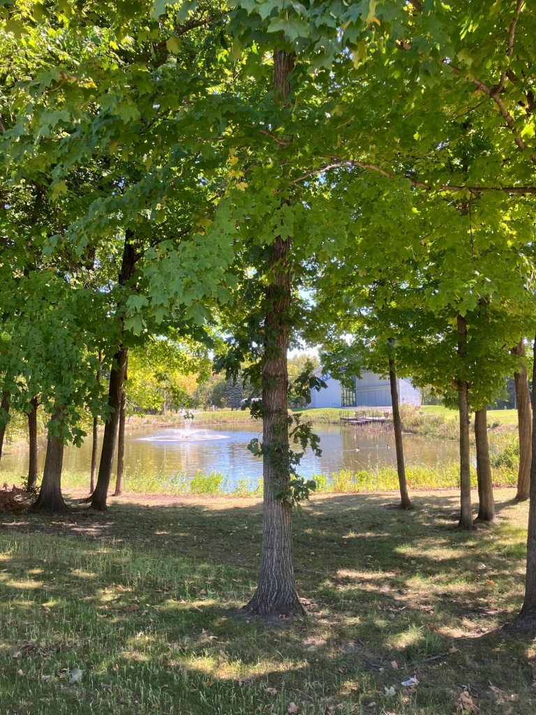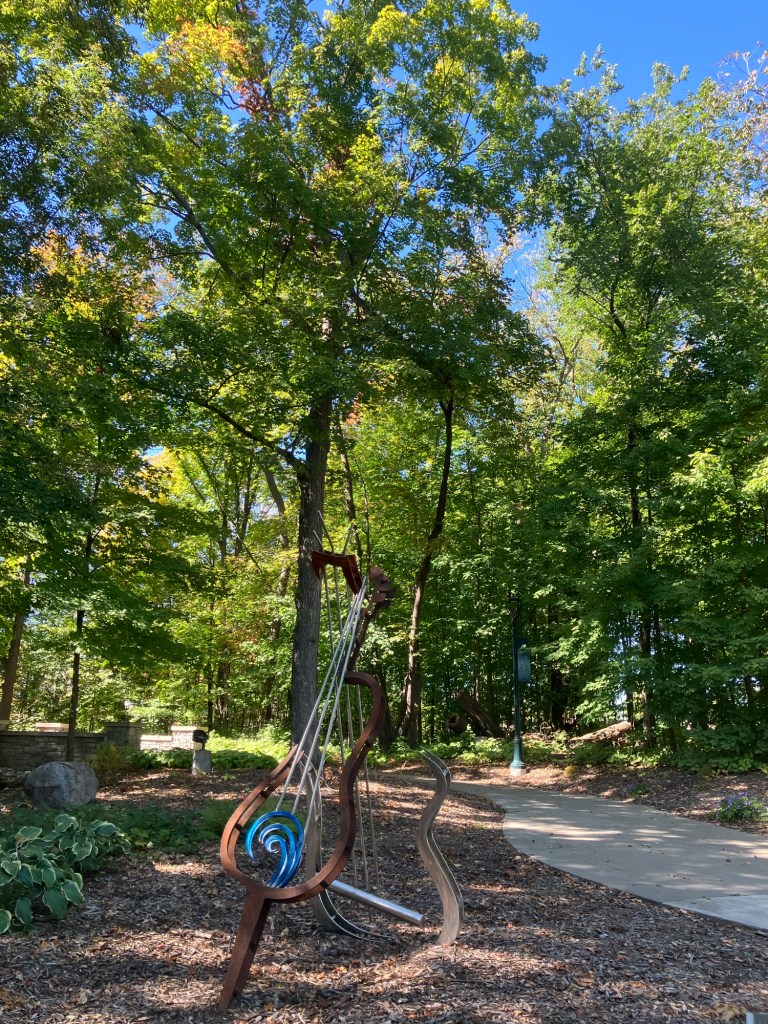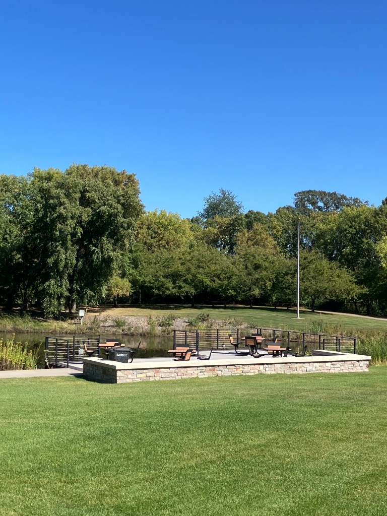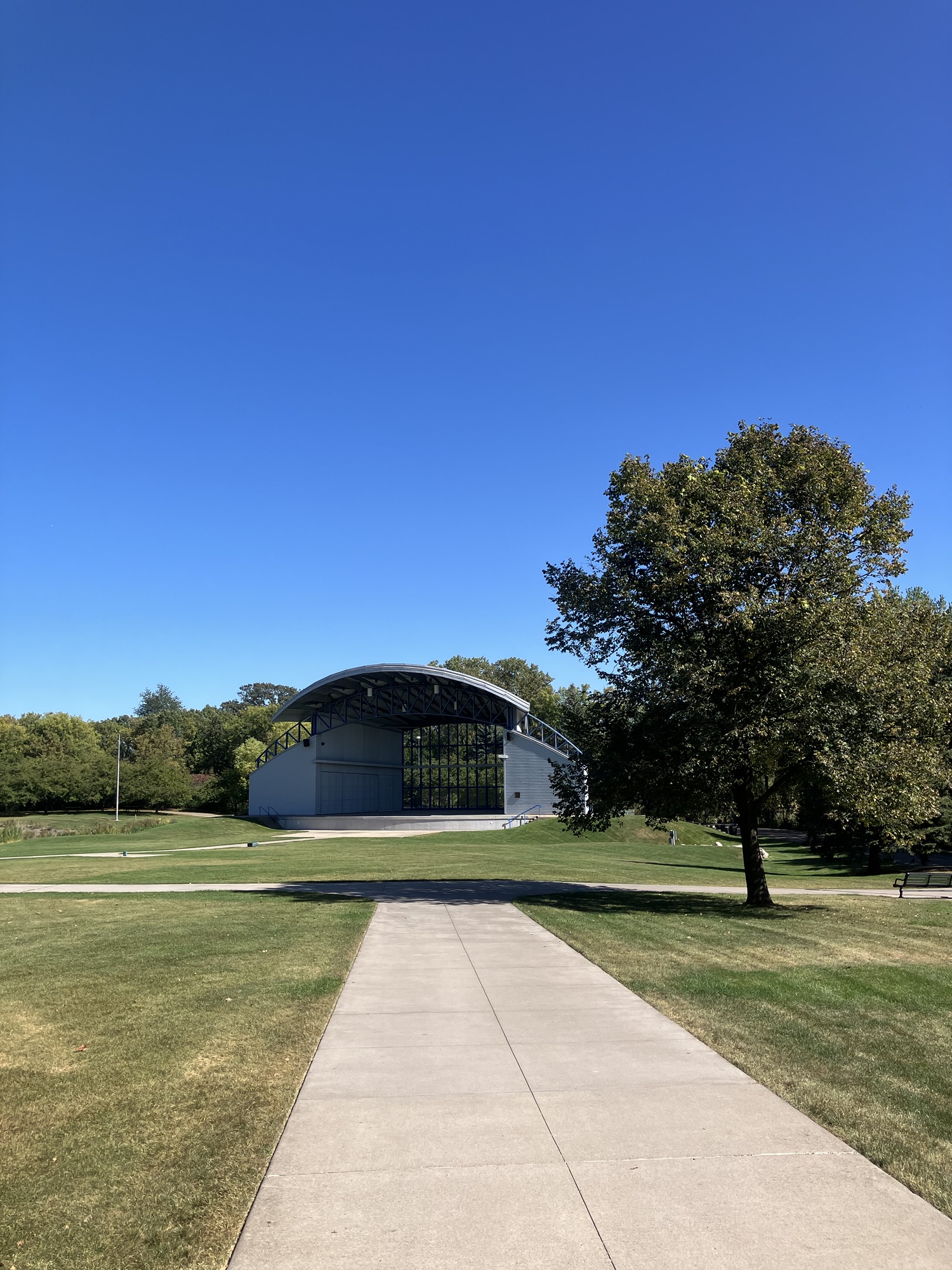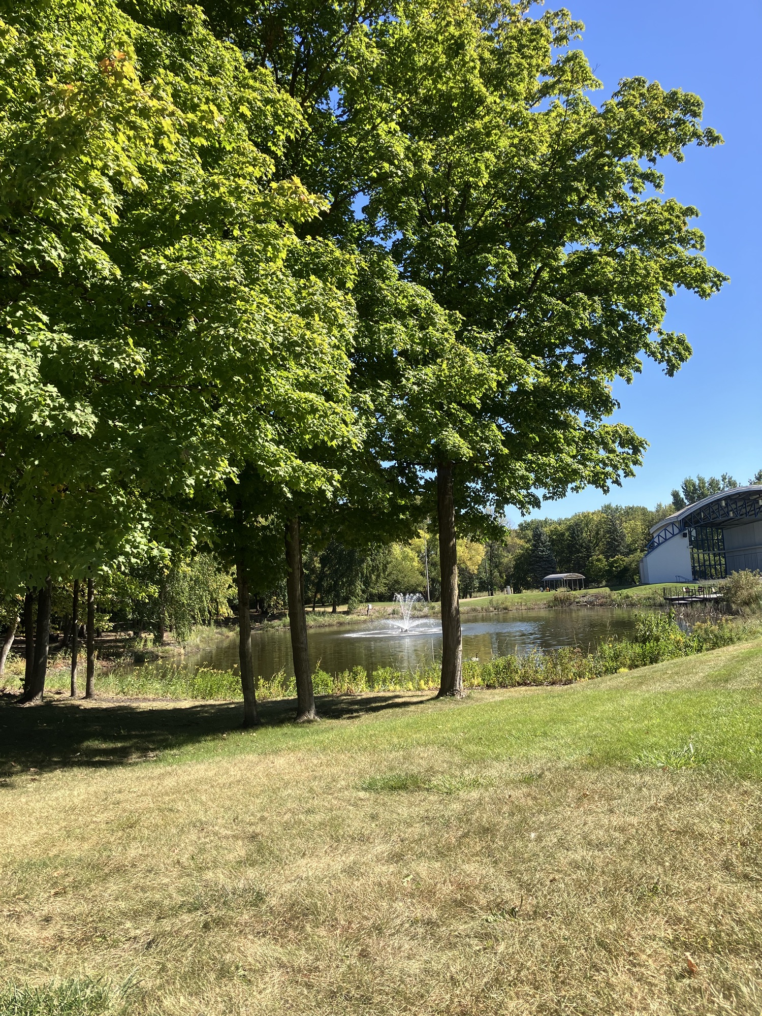 Yes, there’s a beautiful outdoor amphitheater, but there’s so much to this community park! Left of the amphitheater, a small deck with tables and chairs overlooks a pond (be aware of an open drop-off over the water). Walk up the hill to a scenic fountain and cross the bridge over the rain garden to find two large percussion instruments to play! Walk wide around the stand of maple & oaks to a trail circling the pond and spot a hidden pathway to neighboring Millenium Garden!