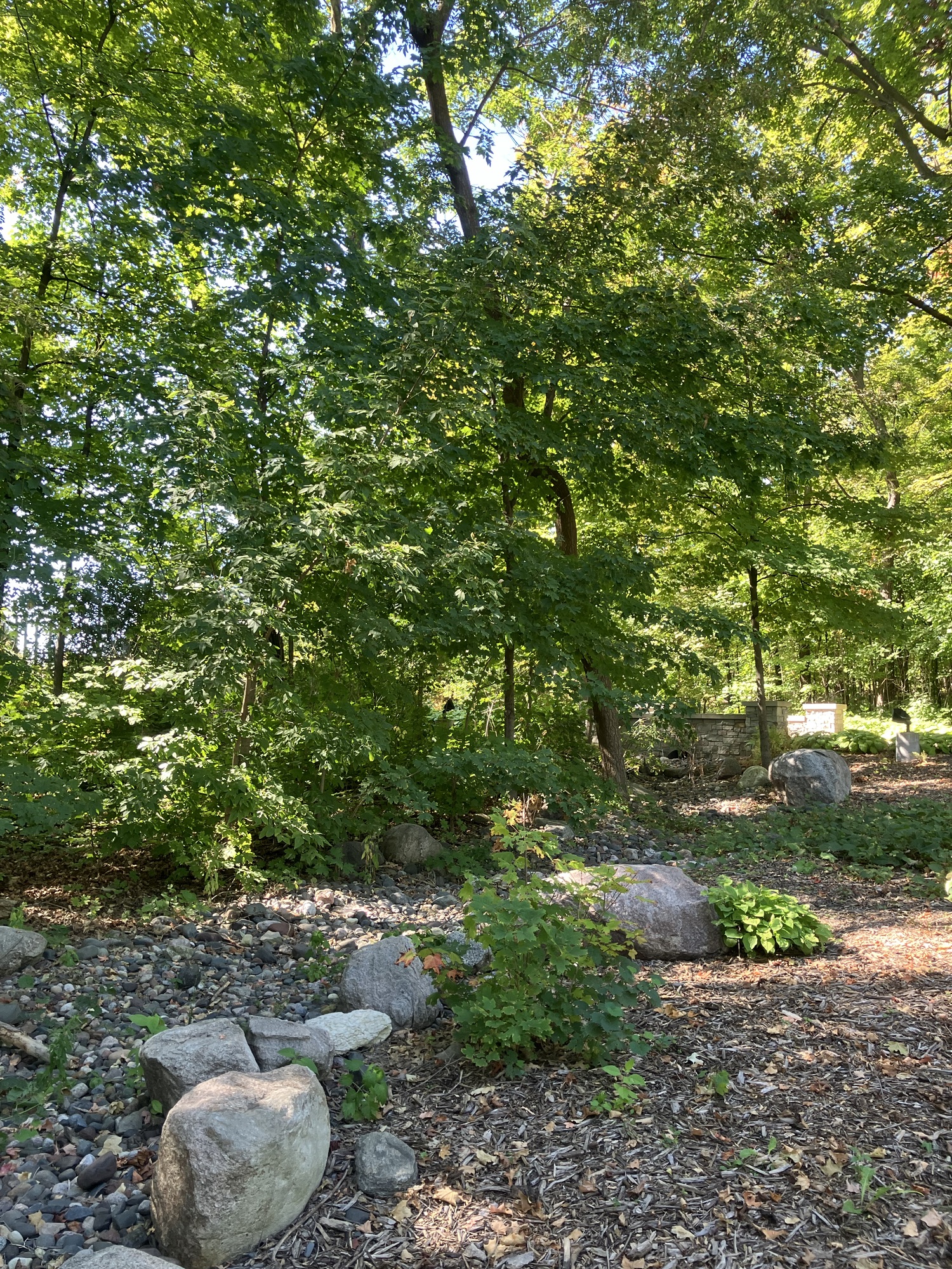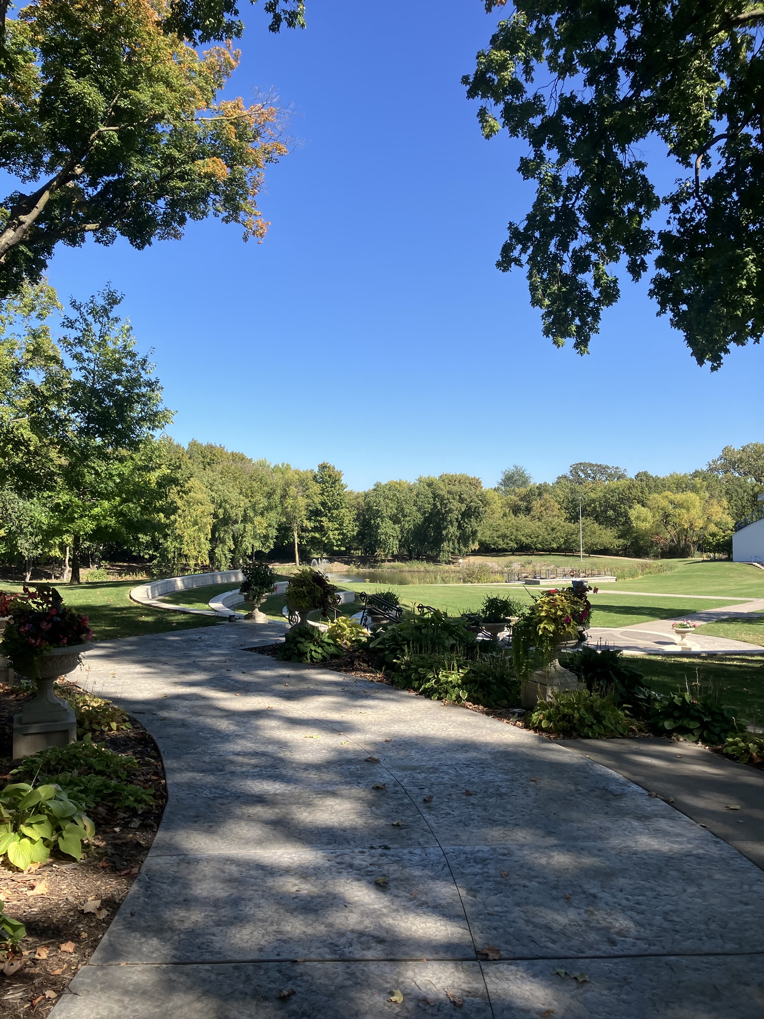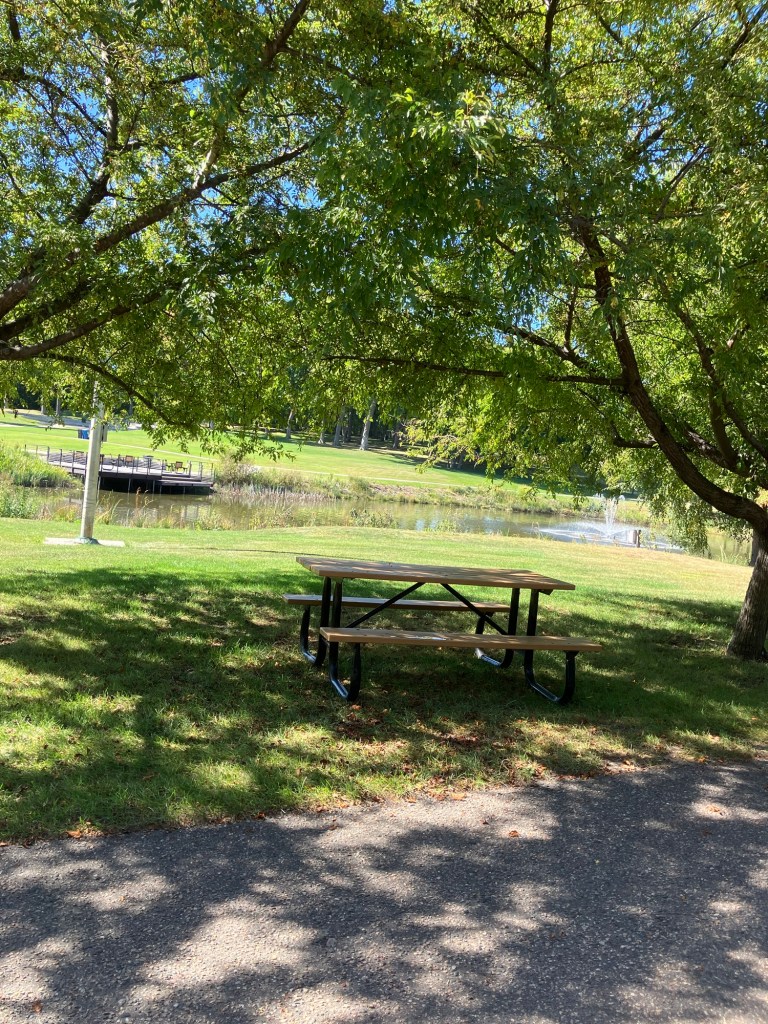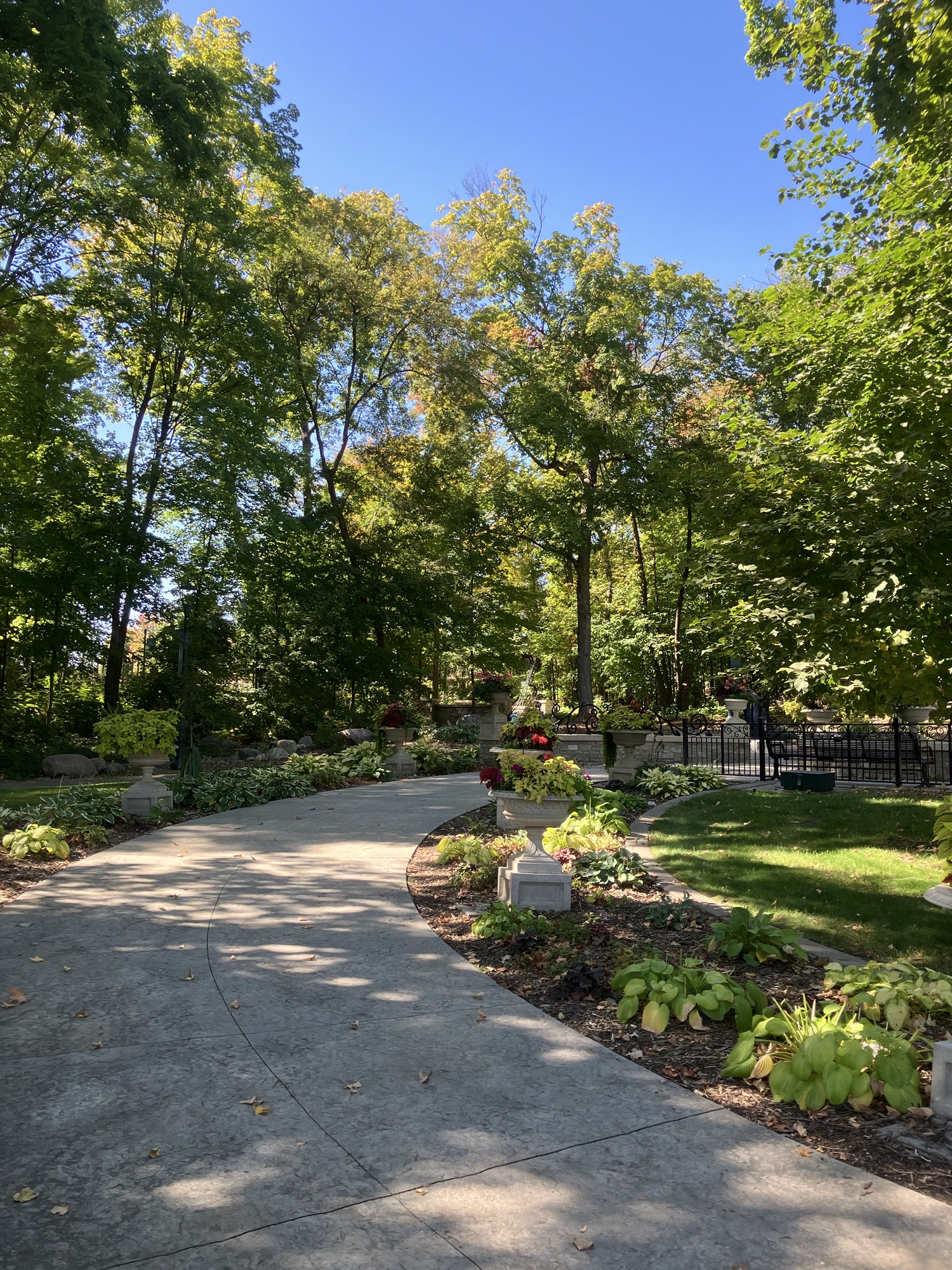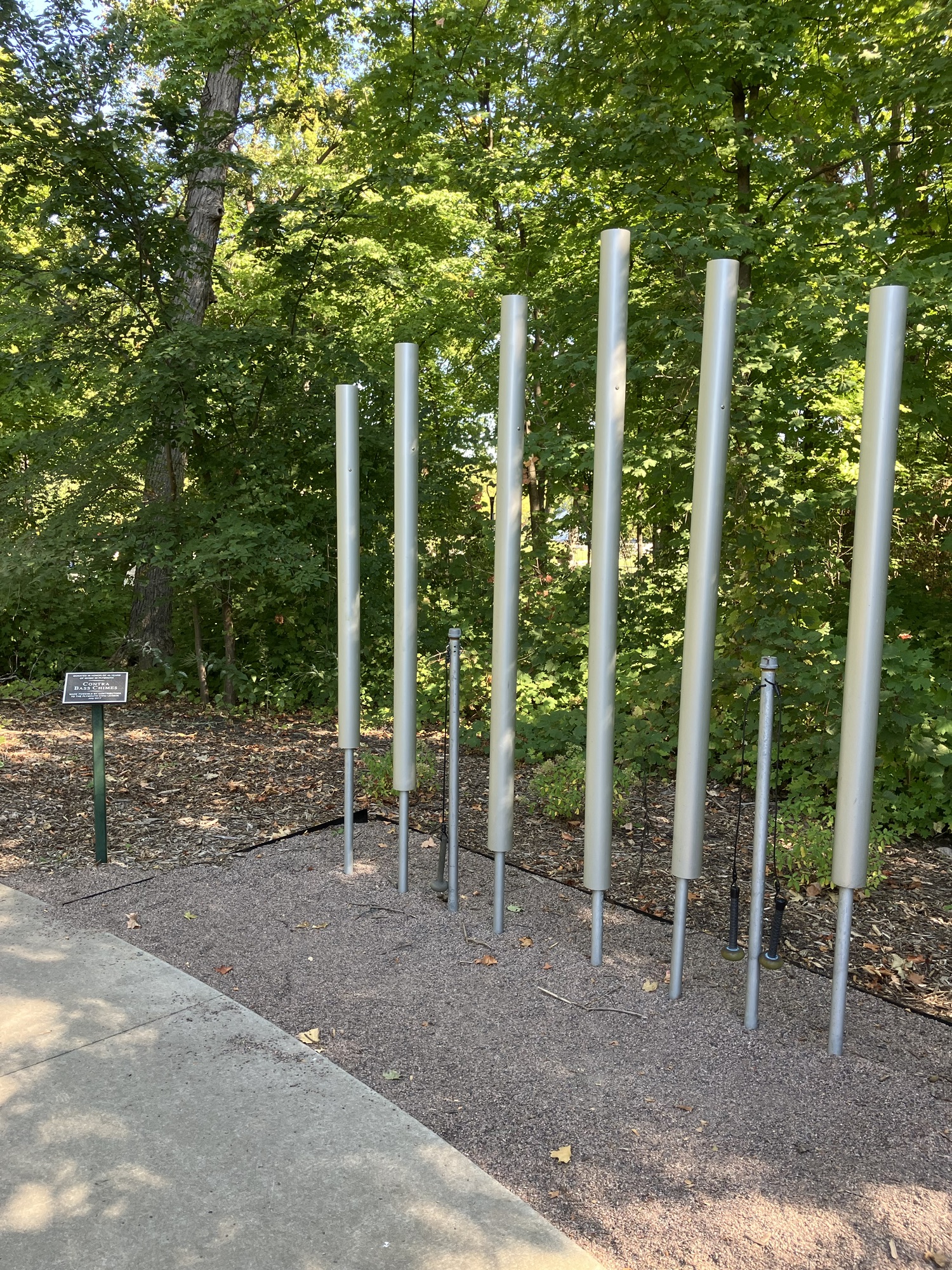 Yes, there’s a beautiful outdoor amphitheater, but there’s so much to this community park! Left of the amphitheater, a small deck with tables and chairs overlooks a pond (be aware of an open drop-off over the water). Walk up the hill to a scenic fountain and cross the bridge over the rain garden to find two large percussion instruments to play! Walk wide around the stand of maple & oaks to a trail circling the pond and spot a hidden pathway to neighboring Millenium Garden!