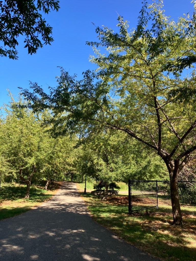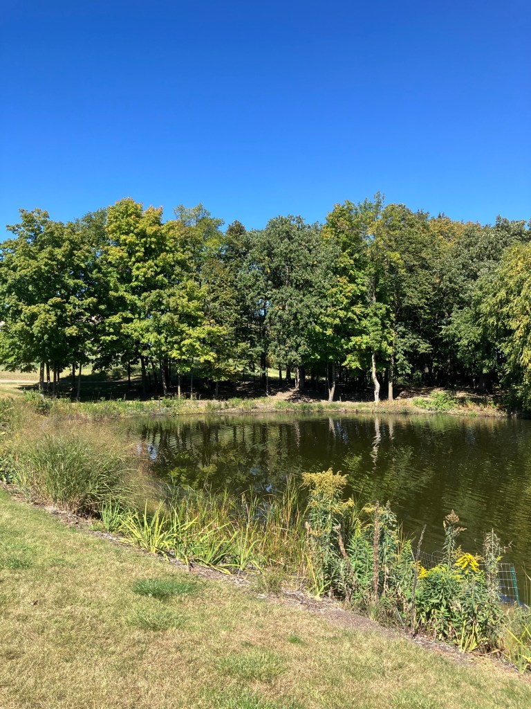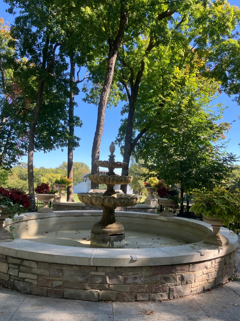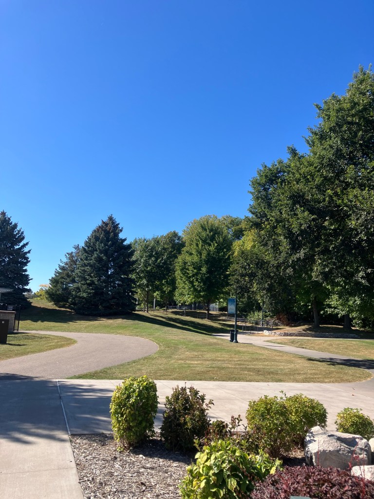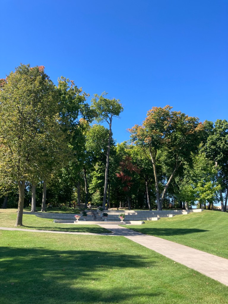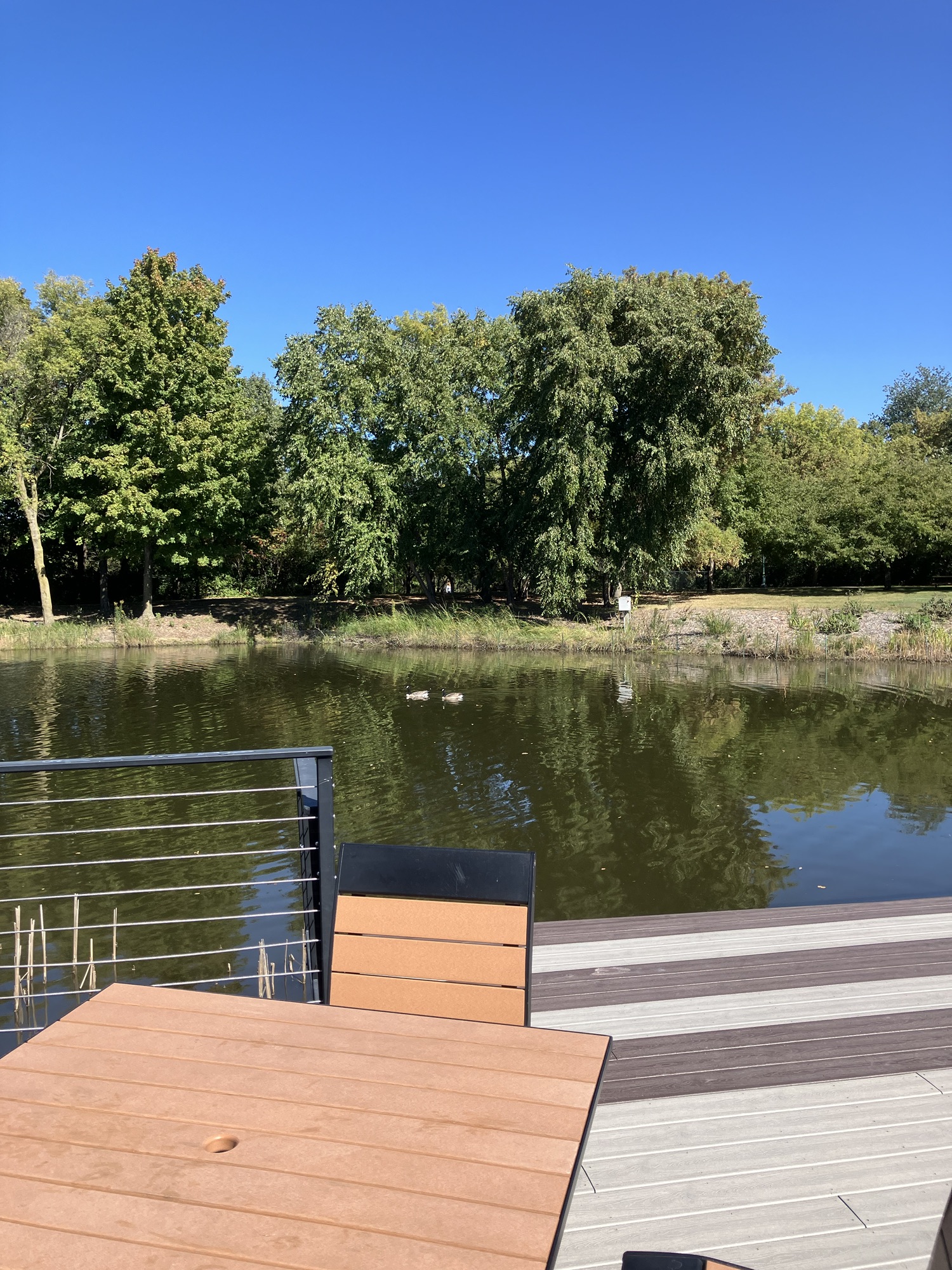Yes, there’s a beautiful outdoor amphitheater, but there’s so much to this community park! Left of the amphitheater, a small deck with tables and chairs overlooks a pond (be aware of an open drop-off over the water). Walk up the hill to a scenic fountain and cross the bridge over the rain garden to find two large percussion instruments to play! Walk wide around the stand of maple & oaks to a trail circling the pond and spot a hidden pathway to neighboring Millenium Garden!