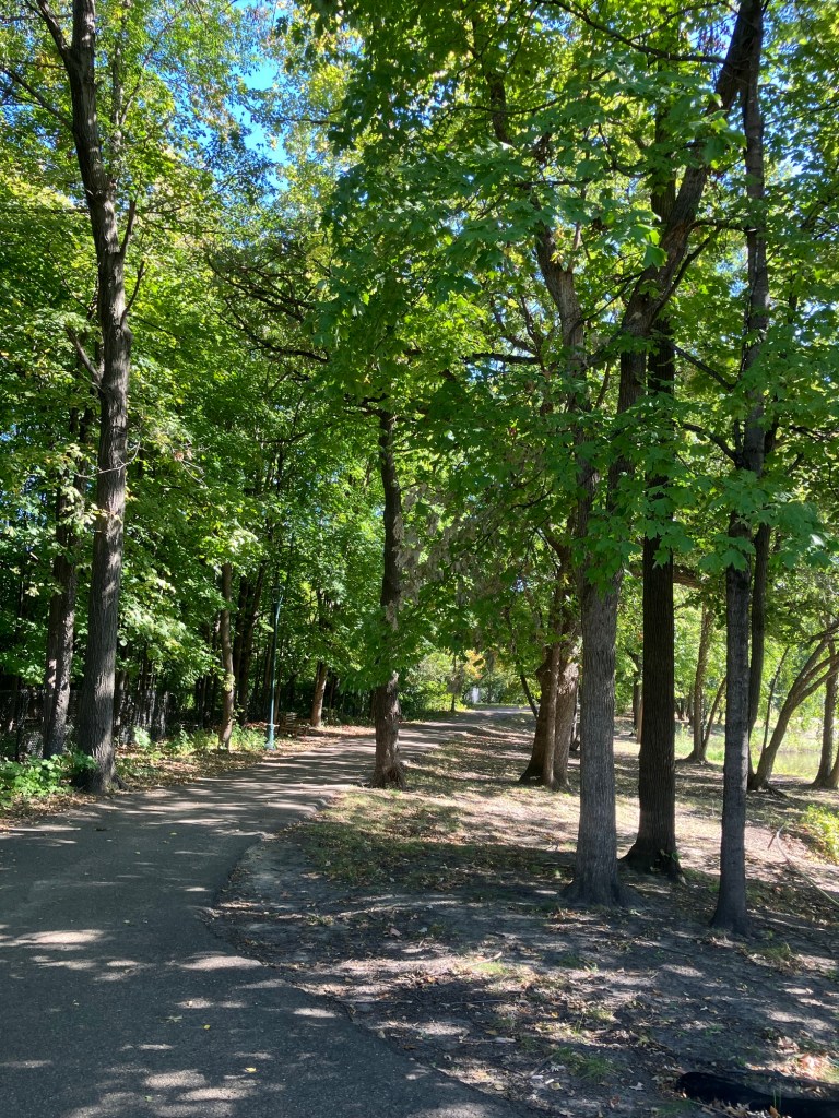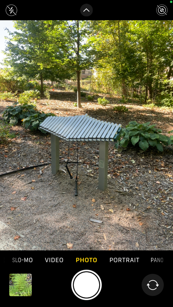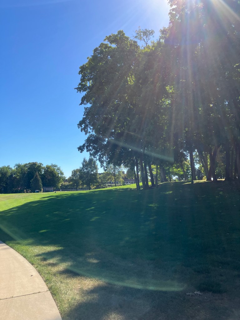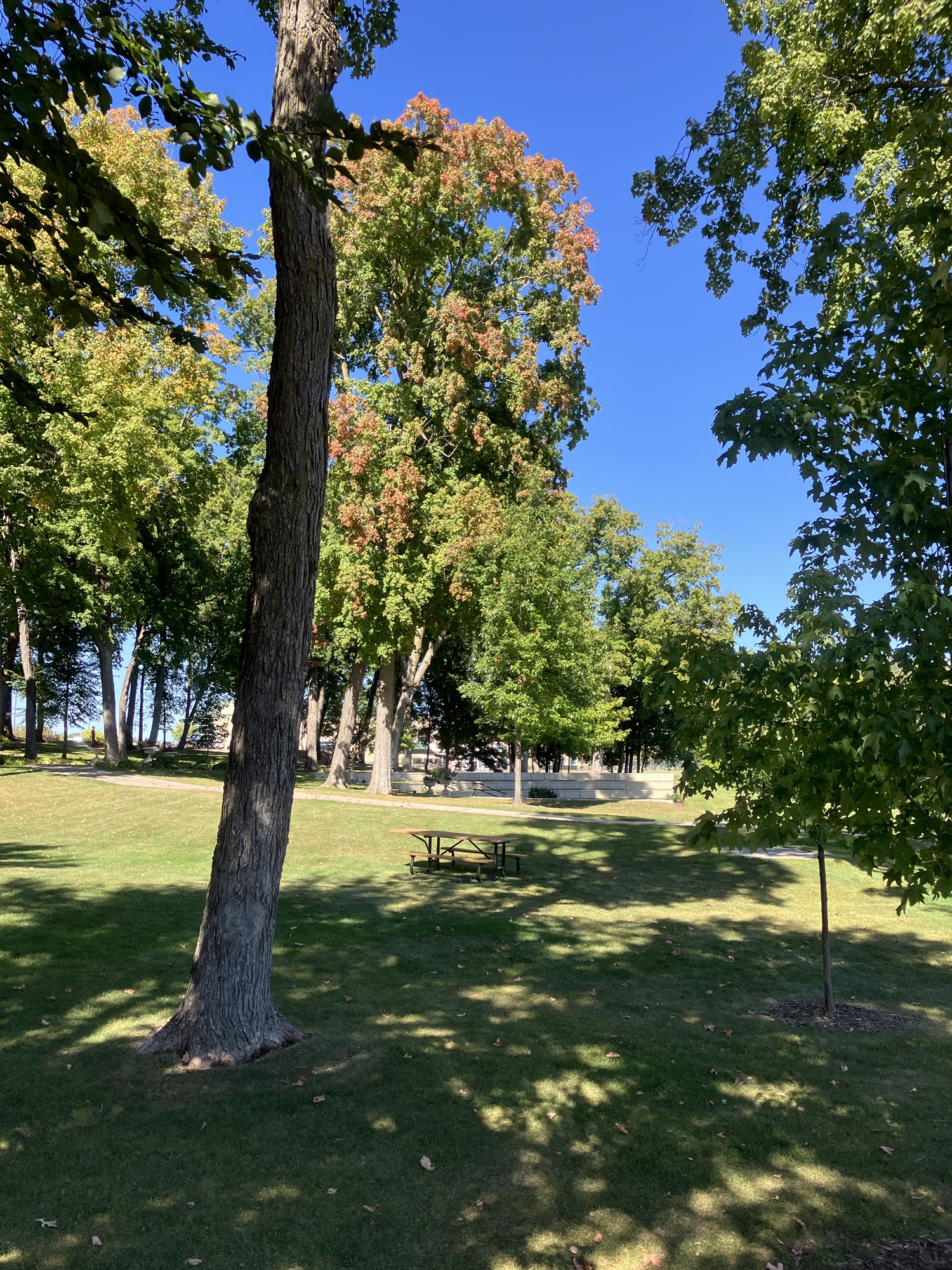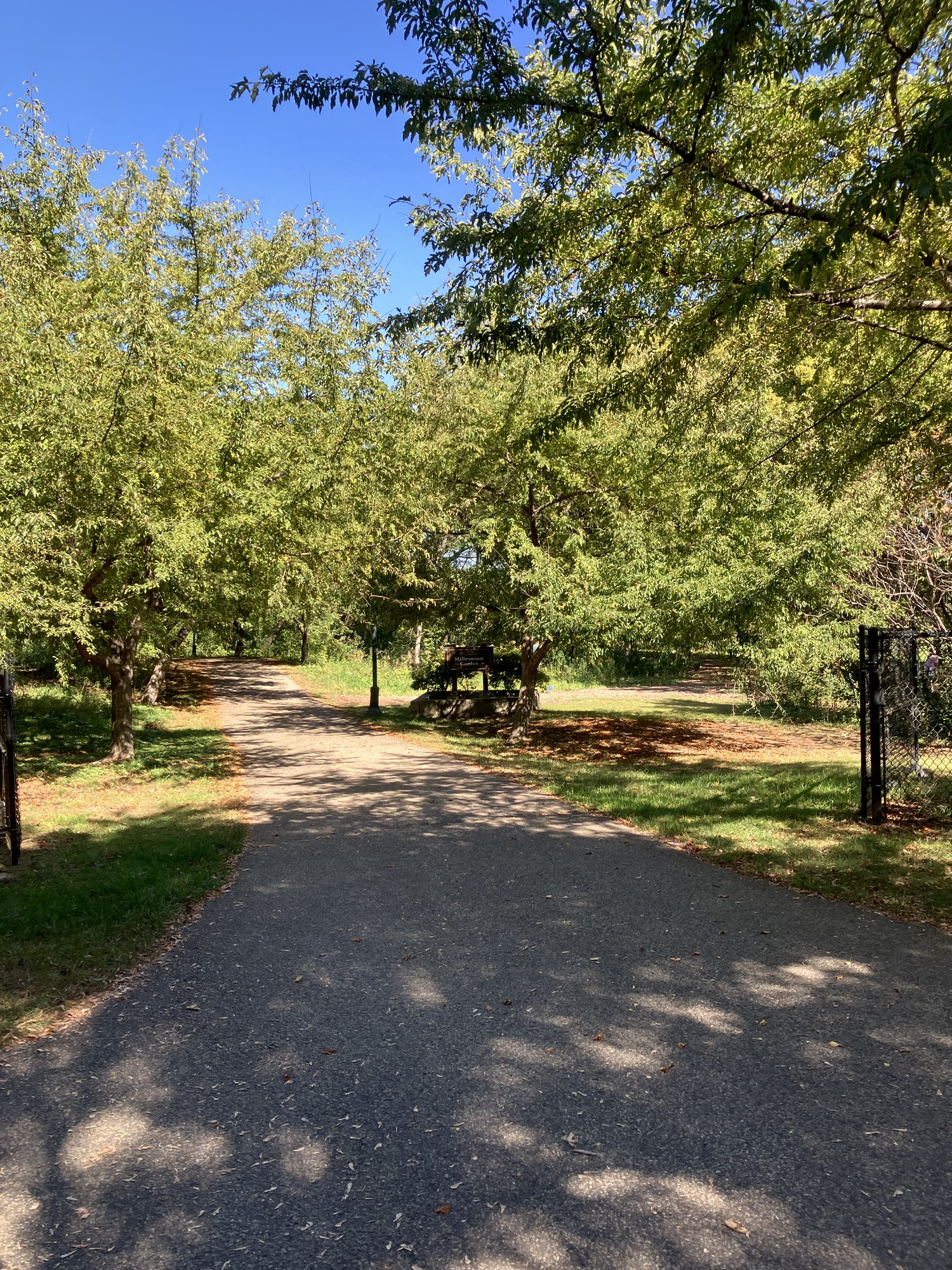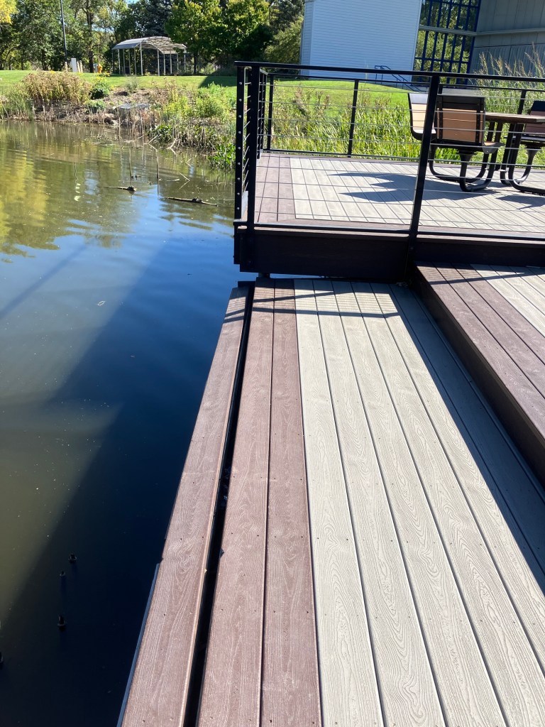Yes, there’s a beautiful outdoor amphitheater, but there’s so much to this community park! Left of the amphitheater, a small deck with tables and chairs overlooks a pond (be aware of an open drop-off over the water). Walk up the hill to a scenic fountain and cross the bridge over the rain garden to find two large percussion instruments to play! Walk wide around the stand of maple & oaks to a trail circling the pond and spot a hidden pathway to neighboring Millenium Garden!