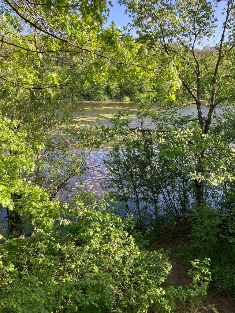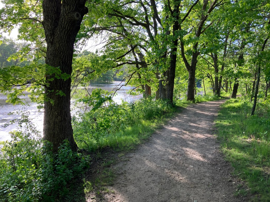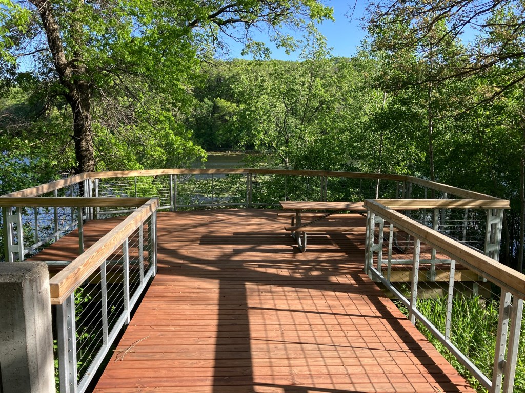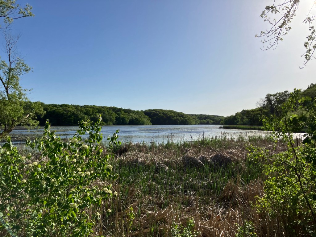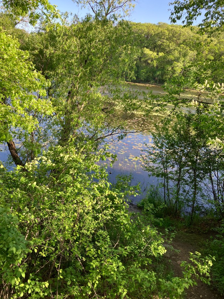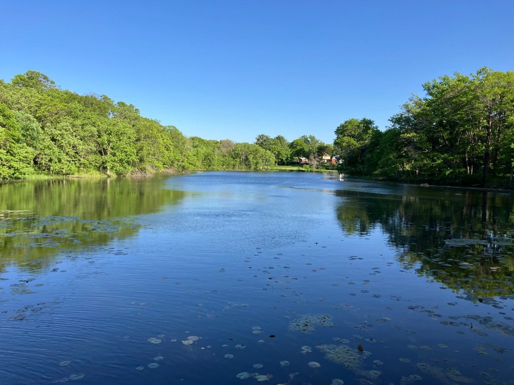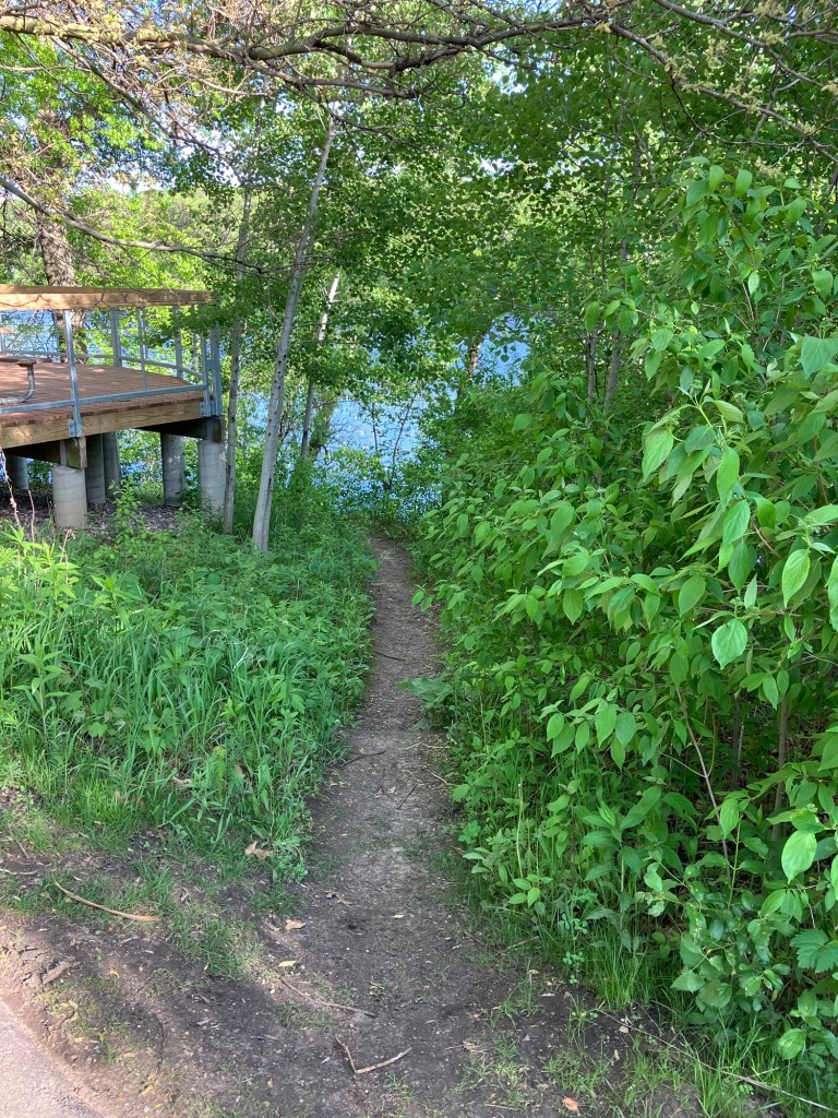Jensen Lake is in a small western section of Lebanon Hills Regional Park in Eagan, MN. Here you can find a tiered playground near the parking lot along side a scenic overlook picnic shelter. Head down the trail from the busy park area and find a lower picnic overlook before beginning a trail loop around Jensen Lake. Unless you can read a map well, be sure to stick on the path closest to the lake or you may find yourself wandering through an extensive trail system through Lebanon Hills. Take time to enjoy the sunlight on the water, the activity of busy muskrats, and the joy of a beautifully-winding trail!