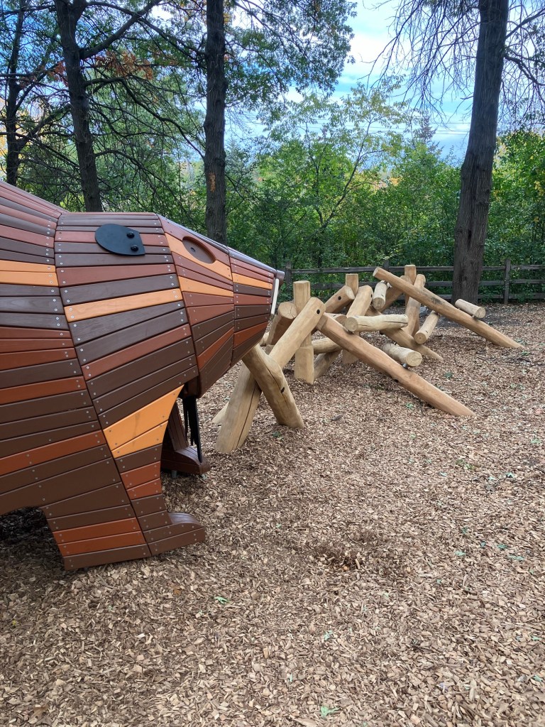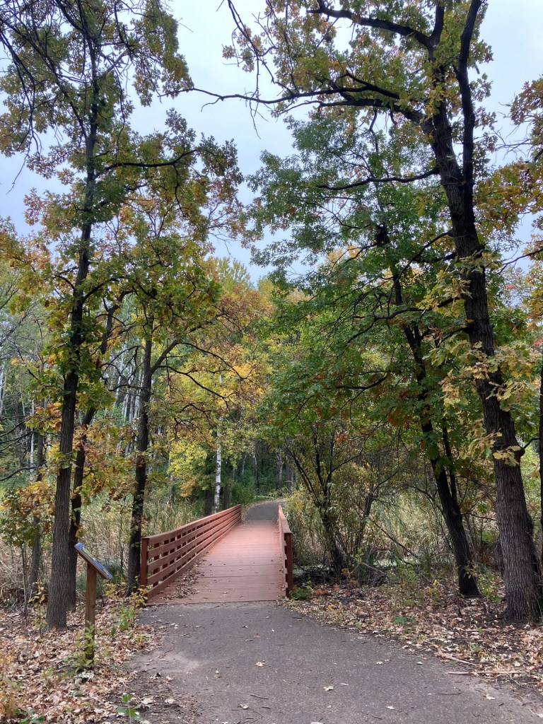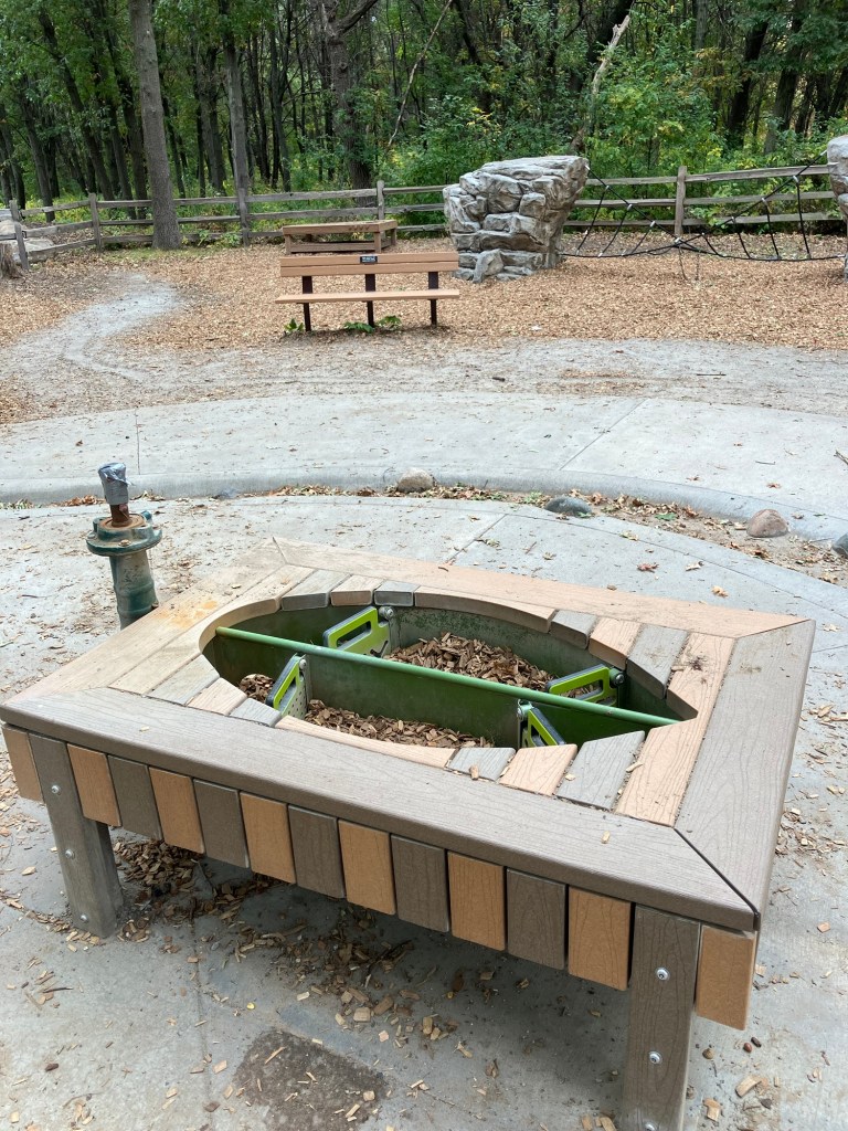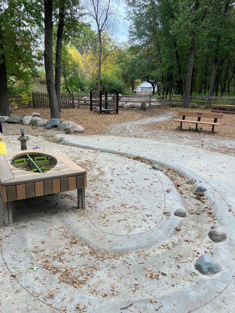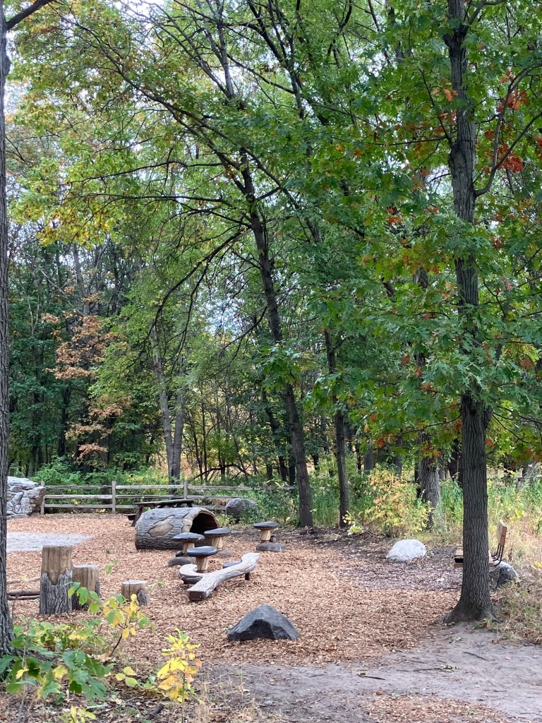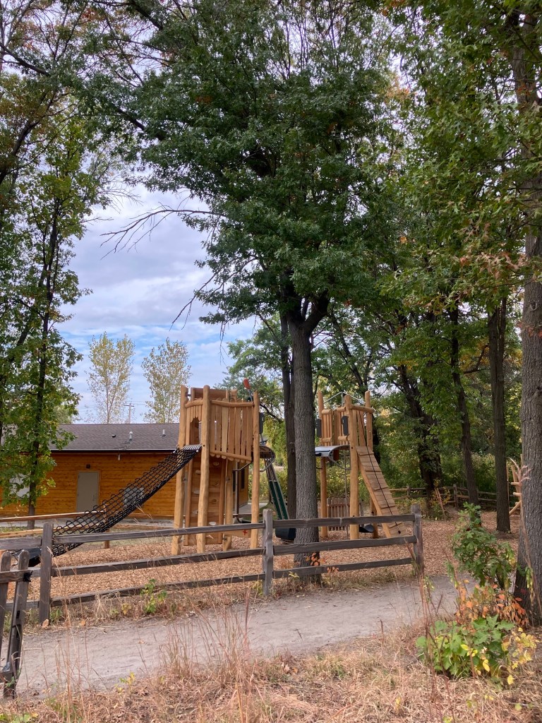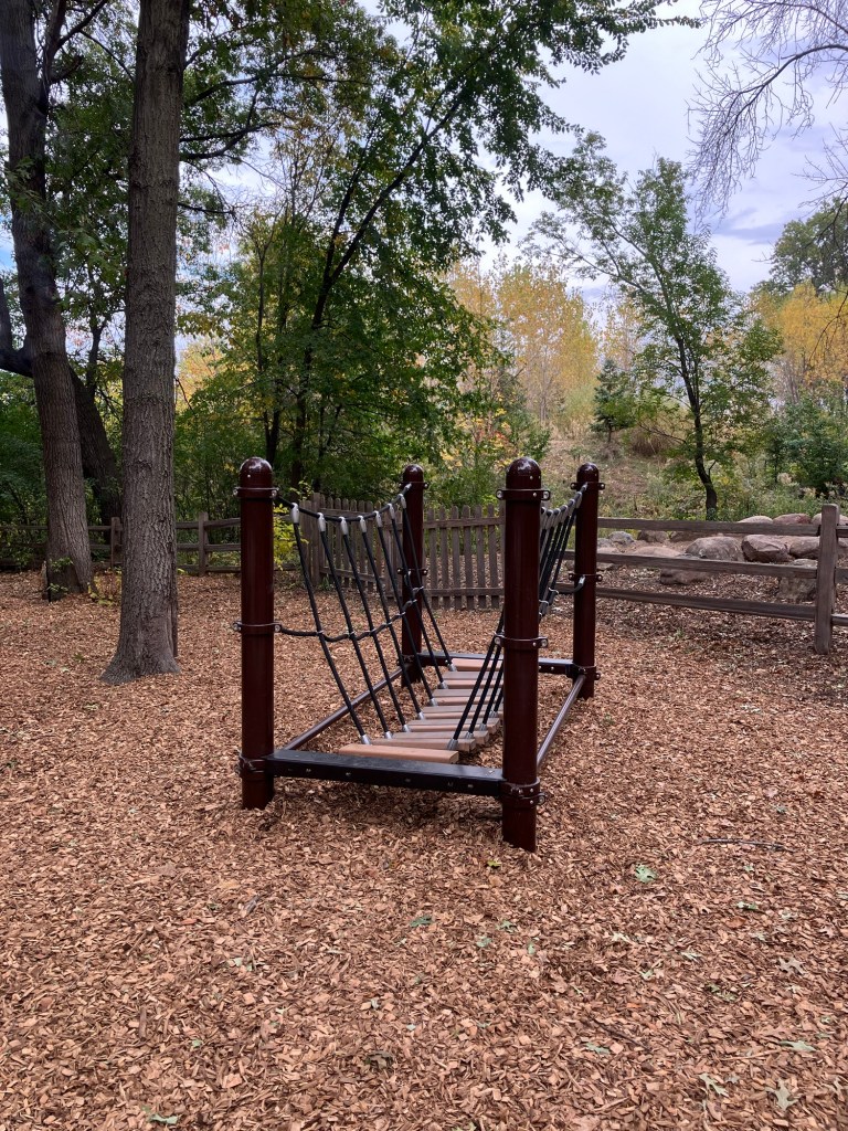 Springbrook Nature Center in Fridley, MN features a network of neat woodland trails connecting to marshy boardwalks, allowing walks of any duration. There are many scenic benches and other places to rest. Running water and bridges abound and the park celebrates its population of beavers who sculpt these waterways. These theme is further explored in the park’s renovated nature playground that is a must-stop in the north metro.