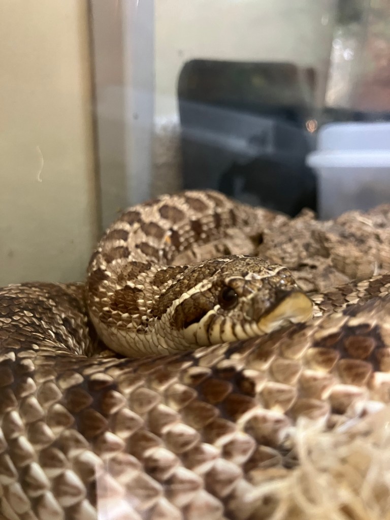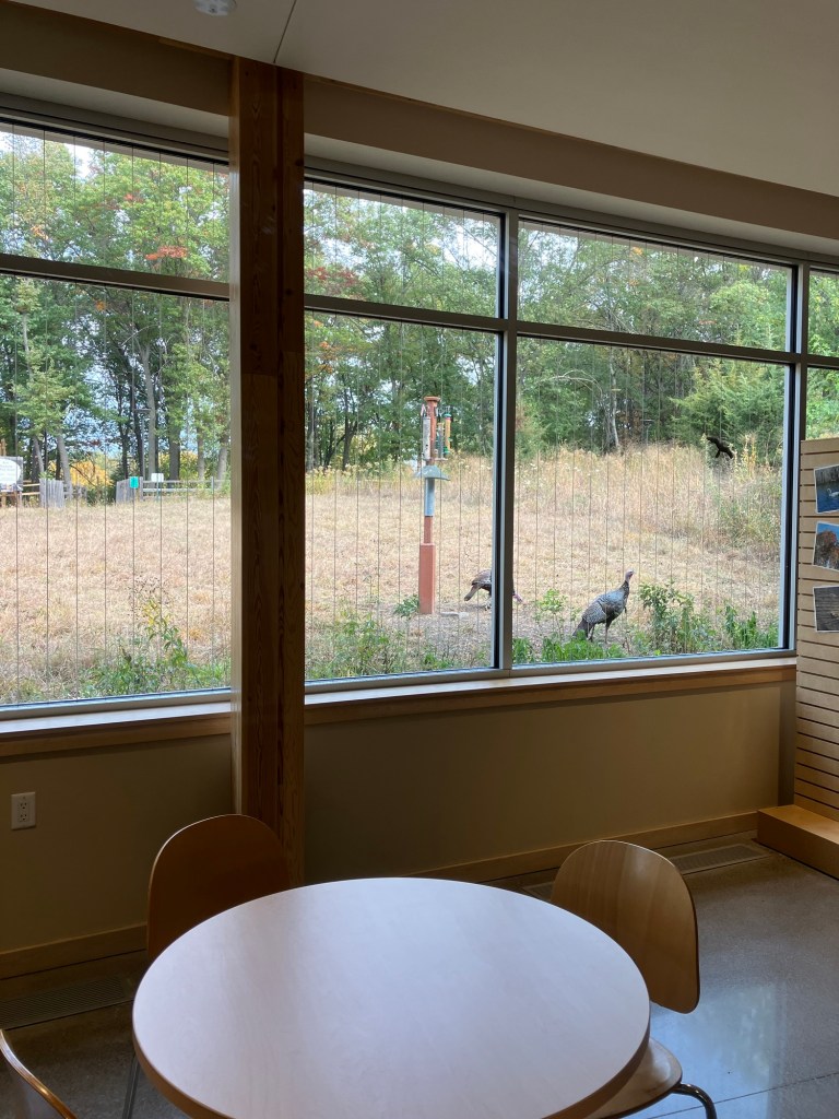Inside the nature center you can find displays of live native animals, large nature dioramas, a nature playhouse structure, a puppet theater, an interactive light board, and tables of manipulatives to construct with. Just outside these windows are birdfeeders frequented by turkeys and woodpeckers. The entrance to the nature center features nice bathrooms, vending machines, and a small area of tables and chairs where food and drinks are allowed.