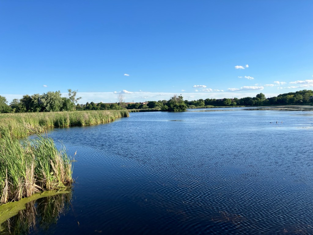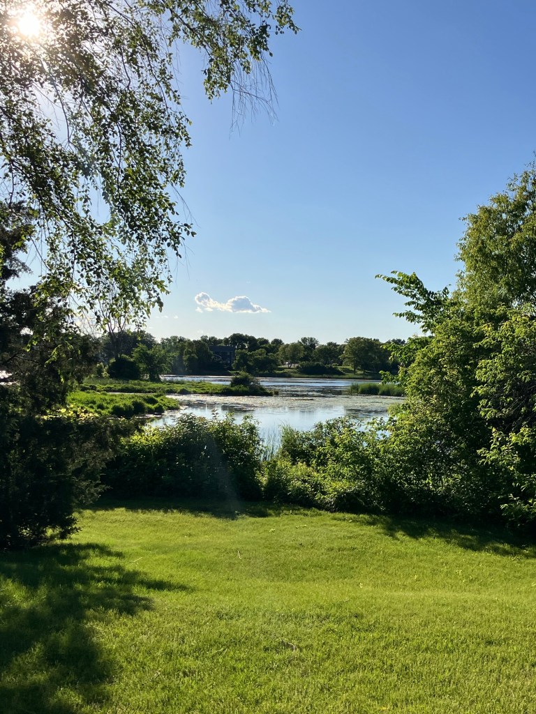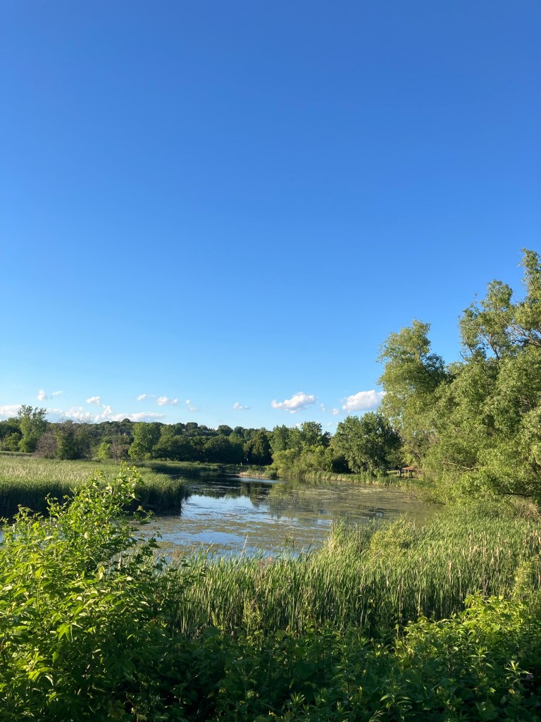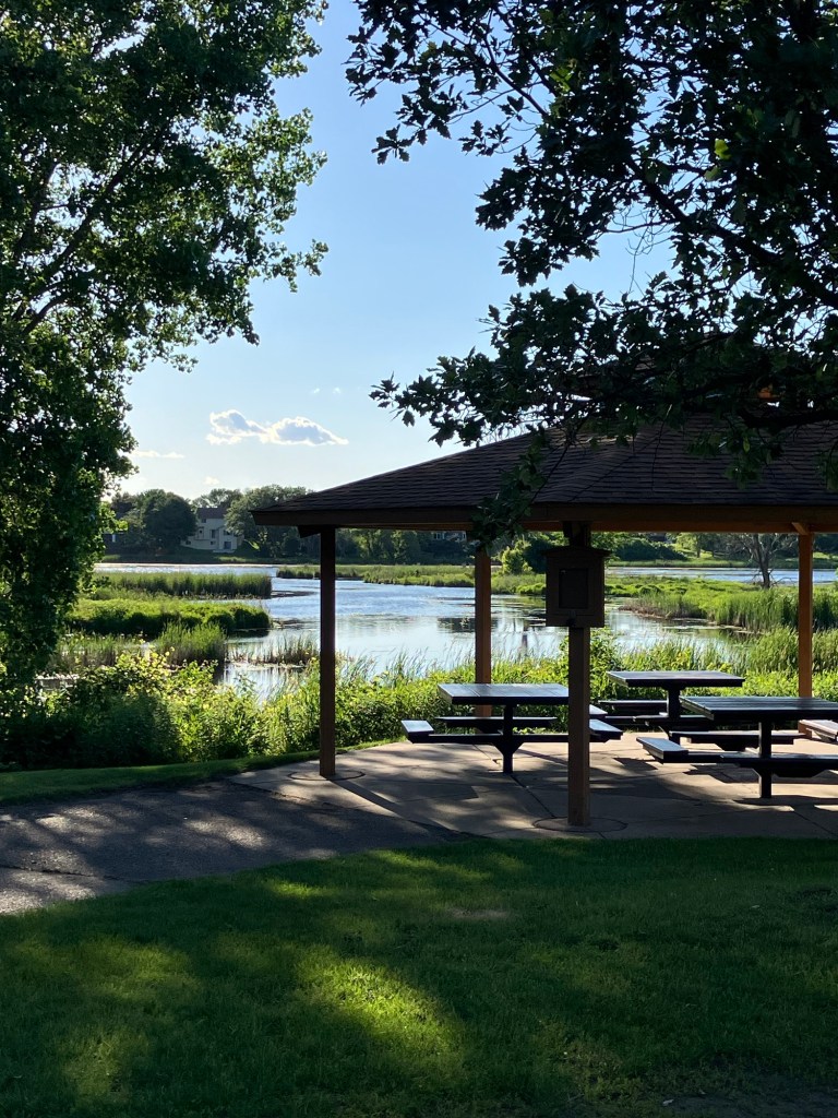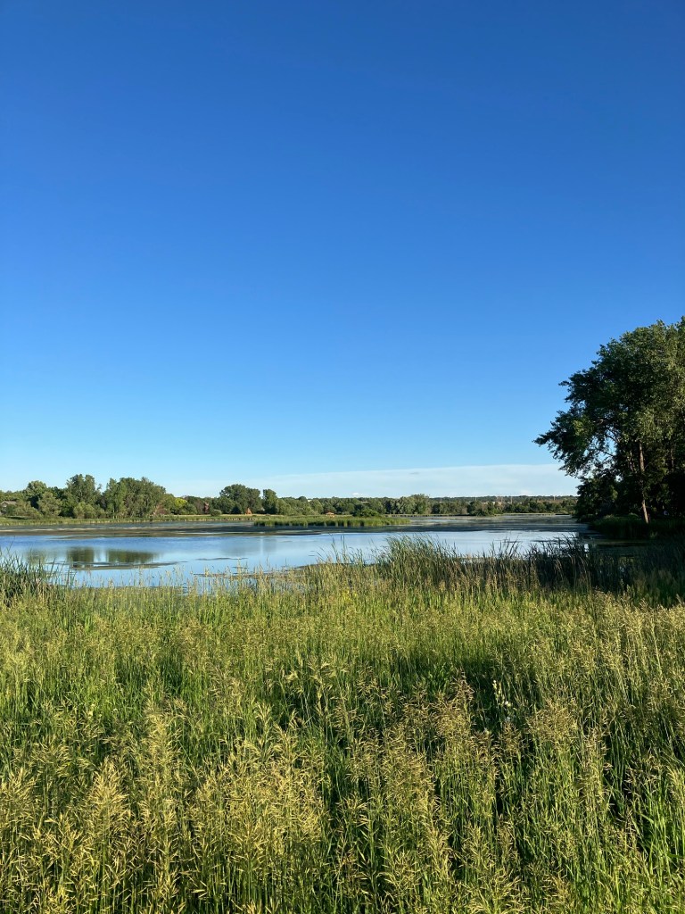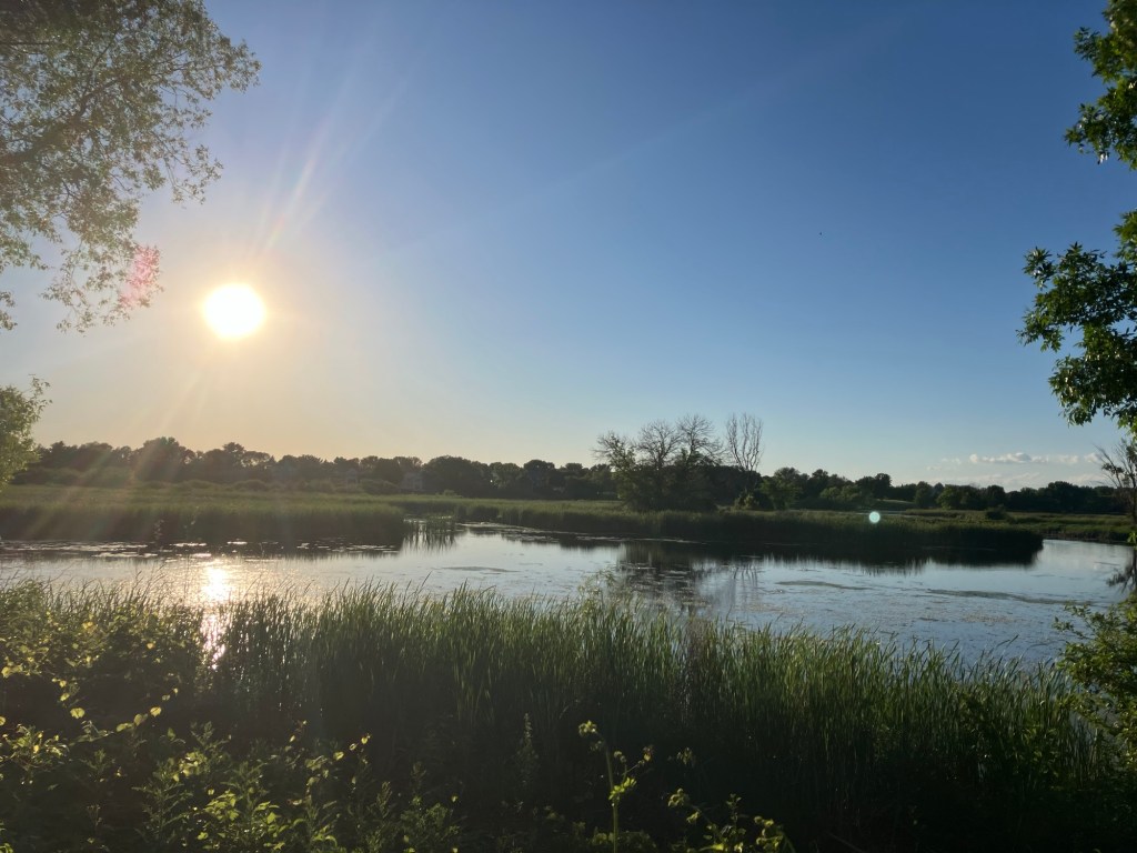 Sunset Pond Park is a large and aptly-named pond in Burnsville, Minnesota. A winding trail and prairie grasses separate the curvy pond from neighborhood backyards on two sides. A playground and corporate building cap the southeast and southwest corners of the pond and a trail at the north end leads through the woods on a beautiful path that will take you to nearby Canterbury Park and beyond! A small trail east at the north end takes you up to the road across a set of abandoned train tracks (we’re certain they’re well out of use due to the trees growing through them).