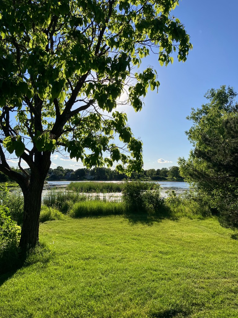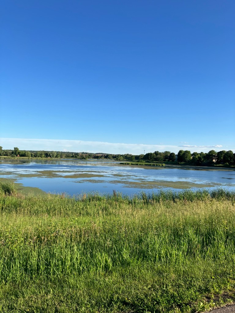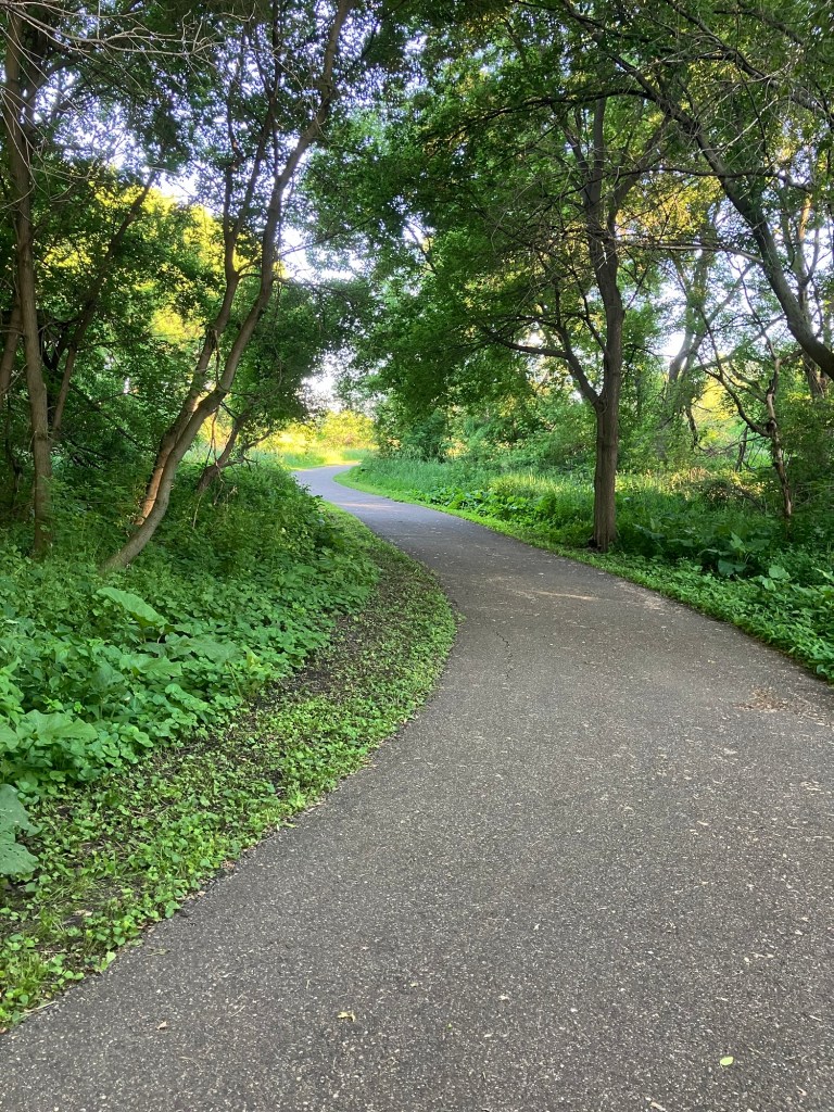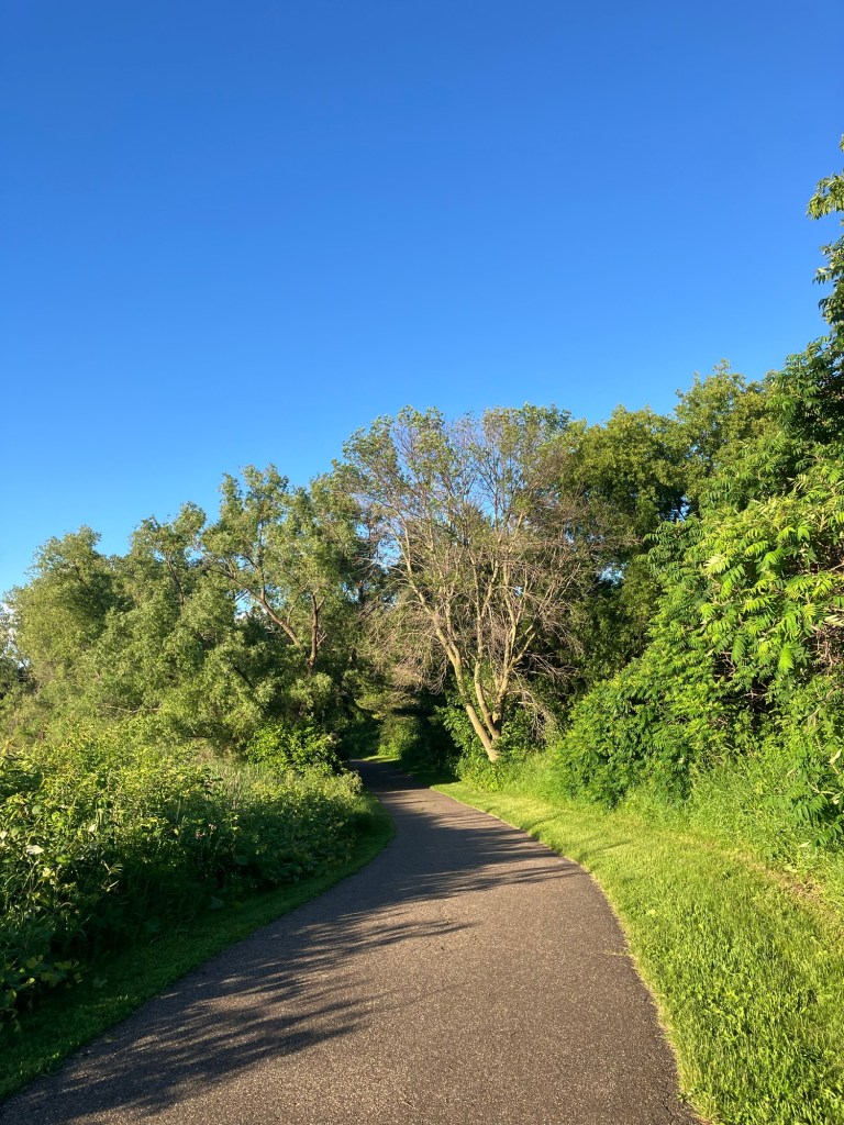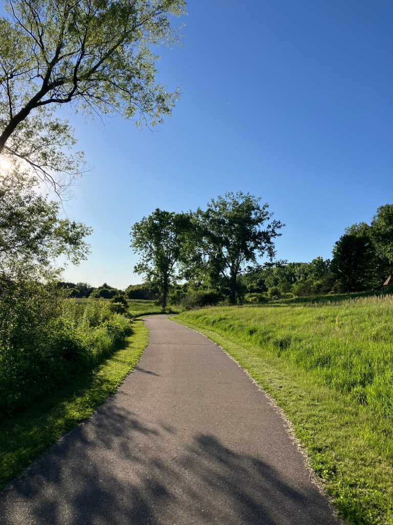 Sunset Pond Park is a large and aptly-named pond in Burnsville, Minnesota. A winding trail and prairie grasses separate the curvy pond from neighborhood backyards on two sides. A playground and corporate building cap the southeast and southwest corners of the pond and a trail at the north end leads through the woods on a beautiful path that will take you to nearby Canterbury Park and beyond! A small trail east at the north end takes you up to the road across a set of abandoned train tracks (we’re certain they’re well out of use due to the trees growing through them).