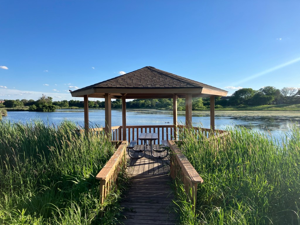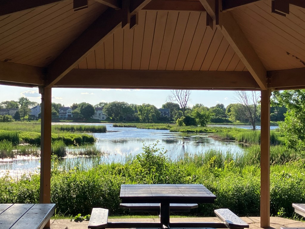 A series of small picnic shelters overlook the main path from well-hidden trails and two larger structures lay close to the water. Within the pond are small islands where you can usually spot a pair of swans. Sunset Pond truly is gorgeous on a summer evening and the main photo for this page was taken as a rainstorm cleared over the park!