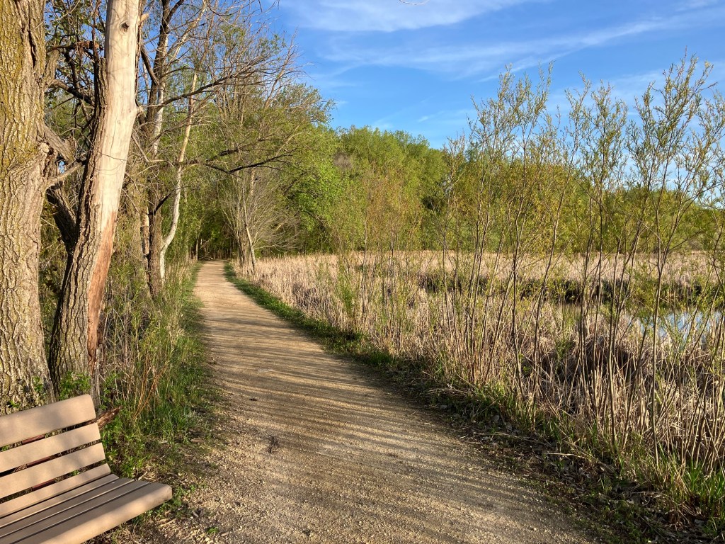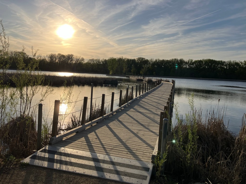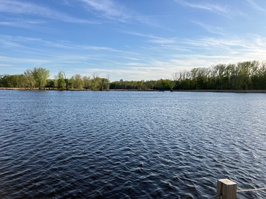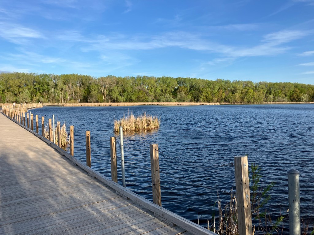 Wood Lake Nature Center in Richfield, MN has a natural play area featuring large loose wood pieces for children to move as well as fixed structures, including a pair of creative wooden stairs set into a hill that lead to a simple plastic hill slide. I’m a big fan of hill slides and we found this perfect for a fearless toddler sliding down backwards on hands and knees and landing safely at the bottom. You can easily spend an hour at Wood Lake walking around the short lake loop with a child while stopping to look at wildlife. Add 15 minutes inside the nature center and 45 out on the playground and you have a whole two-hour excursion for a morning or afternoon. Due to their effect on wildlife, this is the only park in Richfield that does not allow dogs (or bikes) on the grounds.